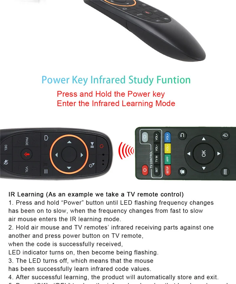 Спасибо за использование продукта нашей компании! Это Беспроводная воздушная мышь со встроенным осевым гироскопом и датчиком гравитационного ускорения и? 0 3 делительный голосовой ввод; Он может выполнять функции традиционного дистанционного управления, компьютерной мыши и игрового контроллера движения на платформе android. Микро-приемник Plug and play совместим с персональным компьютером, проектором, ТВ-боксом, Домашний кинотеатр персональный компьютер и т. Д. Удерживающая воздушную мышь и вращающаяся на запястье, преобразуется в движение курсора по экрану, что позволяет управлять компьютером, проектором и другим развлекательным оборудованием на расстоянии. Эргономика air mouse заменит стационарную компьютерную мышь и инфракрасный кнопочный пульт дистанционного управления, давая вам удобство управлять компьютером и телевизором из положения, которое наиболее удобно для вас.