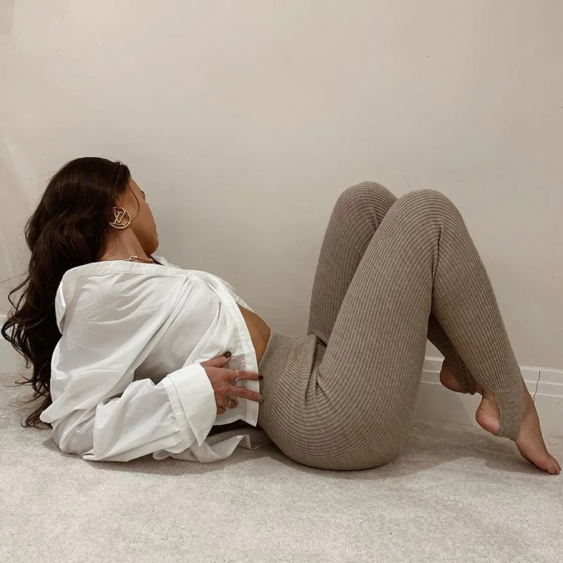 Бежевые трикотажные леггинсы в рубчик 2021, женские хлопковые базов...