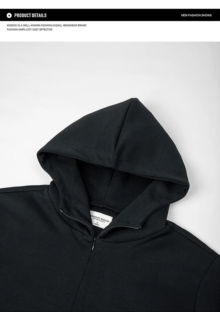 Мужская хлопковая толстовка с капюшоном KUEGOU, черная толстовка с ...