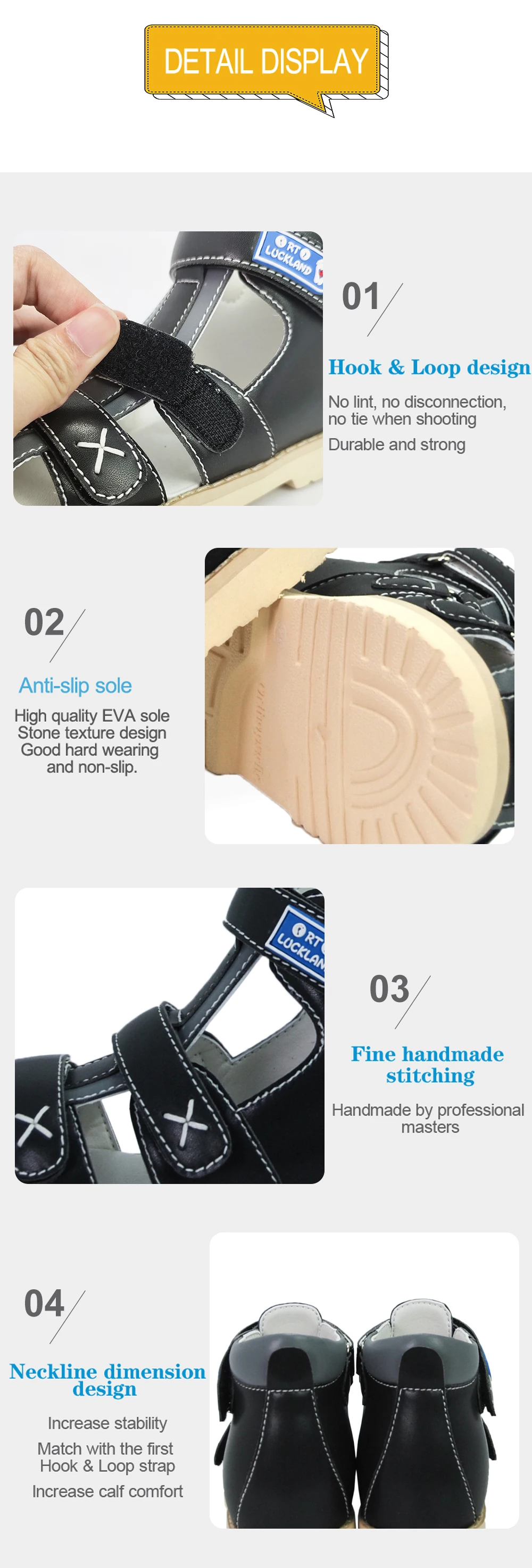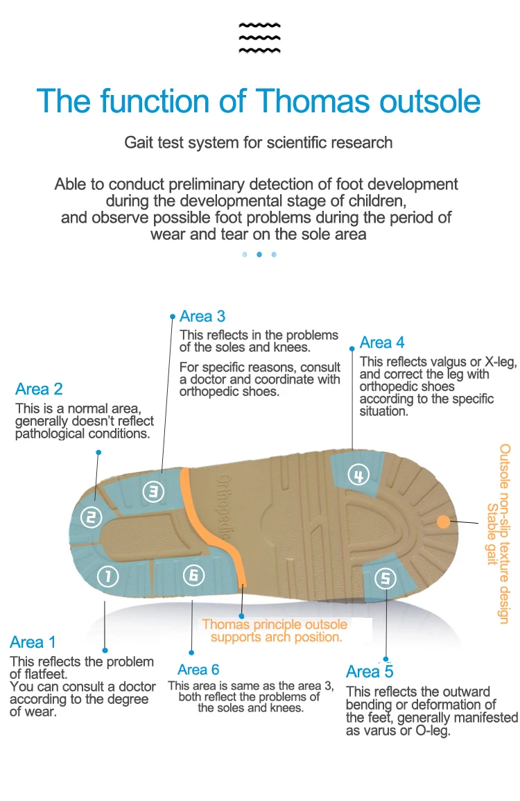 > 1. Каковы ортопедические туфли?Ортопедическая обувь-это медицинская обувь, призванная предотвратить и исправить патологию ног, может защитить стопу сустава и исправить деформацию ног, чтобы помочь здоровому росту суставов детской ноги.> 2. Каковы особенности ортопедической обуви?1) прочные и прочные удлиненные задние колпачки стабилизируют стопу в правильном положении.2) мягкие внутренние воротники обеспечивают гладкий контакт кожи с краями обуви во время движения.3) Арка поддержки стельки и Томас пятки подошвы, чтобы дать поддержку стопы.4) застежка на липучке плотно фиксирует ноги внутри обуви > 3. Каковы функции ортопедической обуви?Для профилактики и лечения ортопедических аномалий. Для предотвращения и исправления детской плоскостопия, лапки, стопа с вальгусной деформацией, супинатором, пронатором, клубной стопой, ногой X/O и т. д. > 4.подходит ли для ортопедической обуви нормальная стопа?Да, нормальные здоровые ноги также подходят для ношения ортопедической обуви. Ортопедическая обувь очень важна для первых шагов ребенка, фиксирует стопу, увеличивает площадь опоры стопы и перераспределяет нагрузку на тело, избегая деформации стопы, чтобы помочь нормальному здоровому росту ног. Поэтому родитель должен начать выбирать ортопедическую обувь для ваших детей, когда ребенок учится ходить.