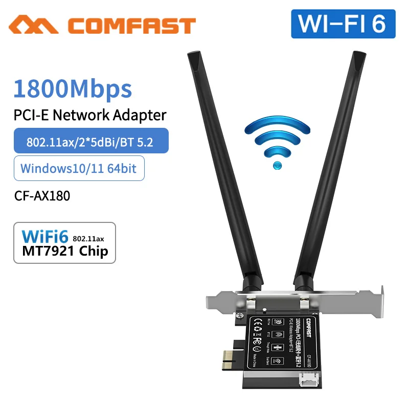 AX180 Wifi 6 карта:MT7921 2 * 5dBi 1800 Мбит/с Bluetooth-совместимый 5,2 Win10/11(64 бит) Поддержка MU-MIMO обычный Wifi адаптер