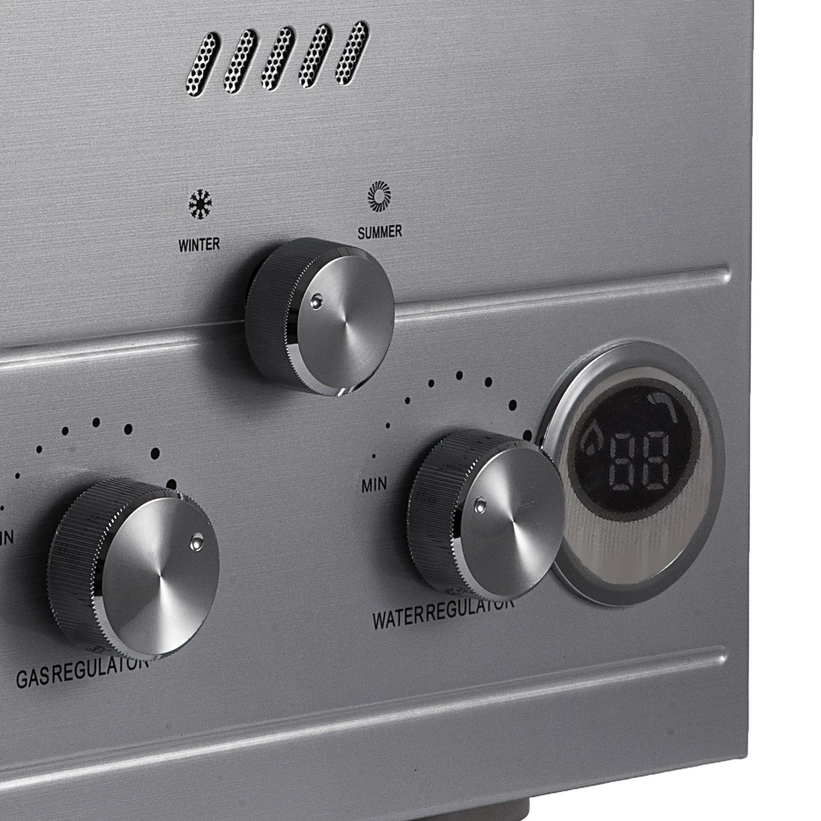 Светодиодный экран и ручкиМы используем светодиодный экран для отображения температуры воды в реальном времени. Регулятор управления газом: поверните его по часовой стрелке, чтобы увеличить подачу газа. Ручка управления водой: поверните его по часовой стрелке, чтобы получить больше горячей воды. Температура воды составляет от 50 ° F до 140 ° F.