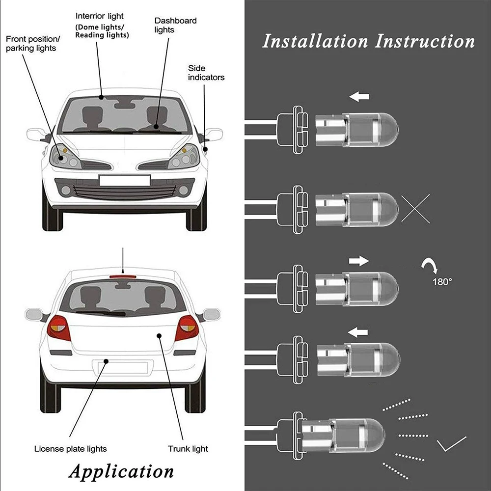 Описание товара: Напряжение: 12 В/постоянный ток Цоколь: T10/W5W/194 Особенности: 1. Ударопрочность и вибрация 2. Срок службы более 80 000 часов в 100 раз дольше стандартных ламп 3. Низкое тепловыделение, низкое энергопотребление 4. Простота установки, прямая замена для ваших ламп на складе 5.100% безопасно для использования на транспортных средствах и лодках Посылка включает в себя: 10 шт. T10 W5W светодиодный светильник. Примечание по установке: Этот светодиодный светильник является чувствительным к поляру, поэтому чехол не подсвечивается, пожалуйста, переверните его на 180 градусов.