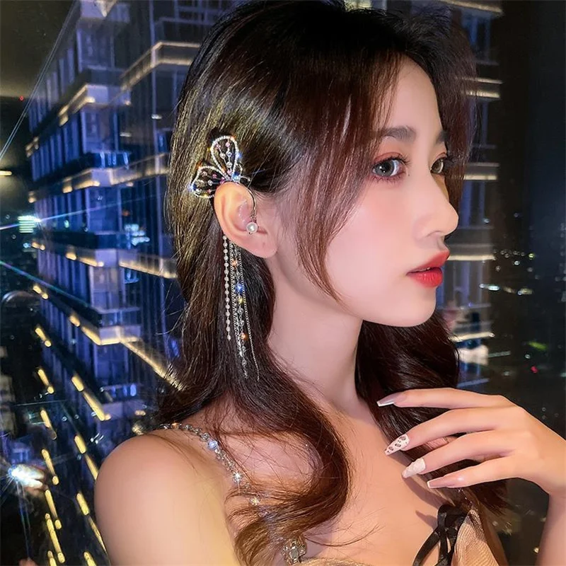 1 шт. модные длинные серьги-клипсы с бабочкой, серьги-клипсы с крючком и жемчугом без проколотых ушей, серьги-цепочки для женщин и девочек, ювелирные изделия в подарок