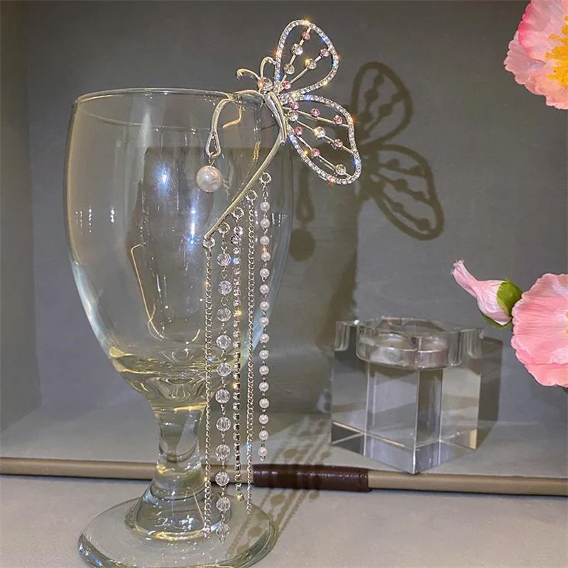 Серьги-клипсы с кристаллами в виде бабочки, длинные кисточки, жемчу...