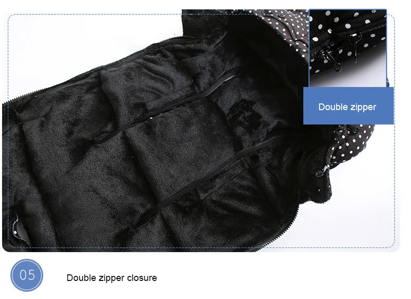Нижняя часть спального мешка выполнена с двумя молниями, поэтому мамы могут легко менять подгузники даже в холодную зиму на открытом воздухе.