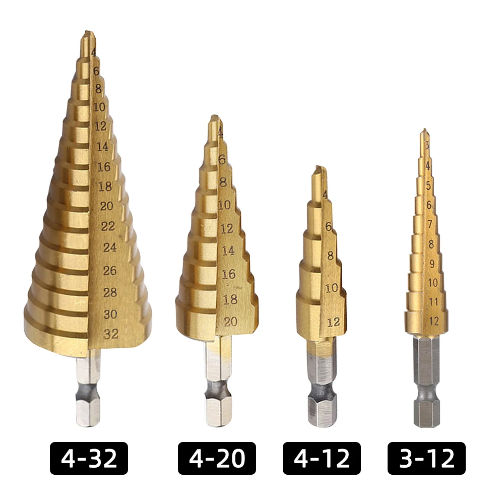 Набор ступенчатых Сверл из быстрорежущей стали с титановым покрытием и прямымспиральным пазом, шестигранный хвостовик для листового алюминия, металла, дерева (с сумкой)