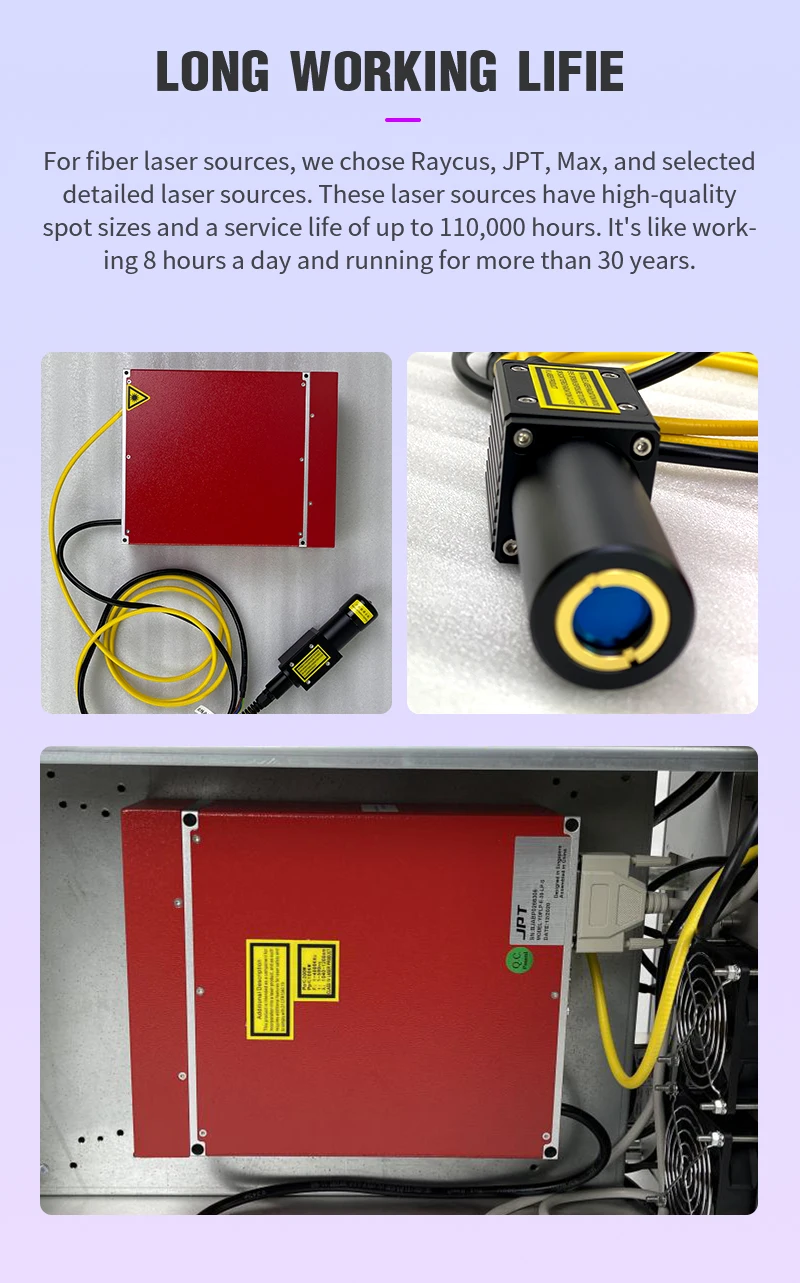 Волоконный лазерный источник мы выбираем Raycus, JPT, Max с детализацией выбранного лазерного источника с высоким качеством размера пятна и длительным сроком службы более 110000 часов работы. 8 часов в рабочий день работает более 30 лет.