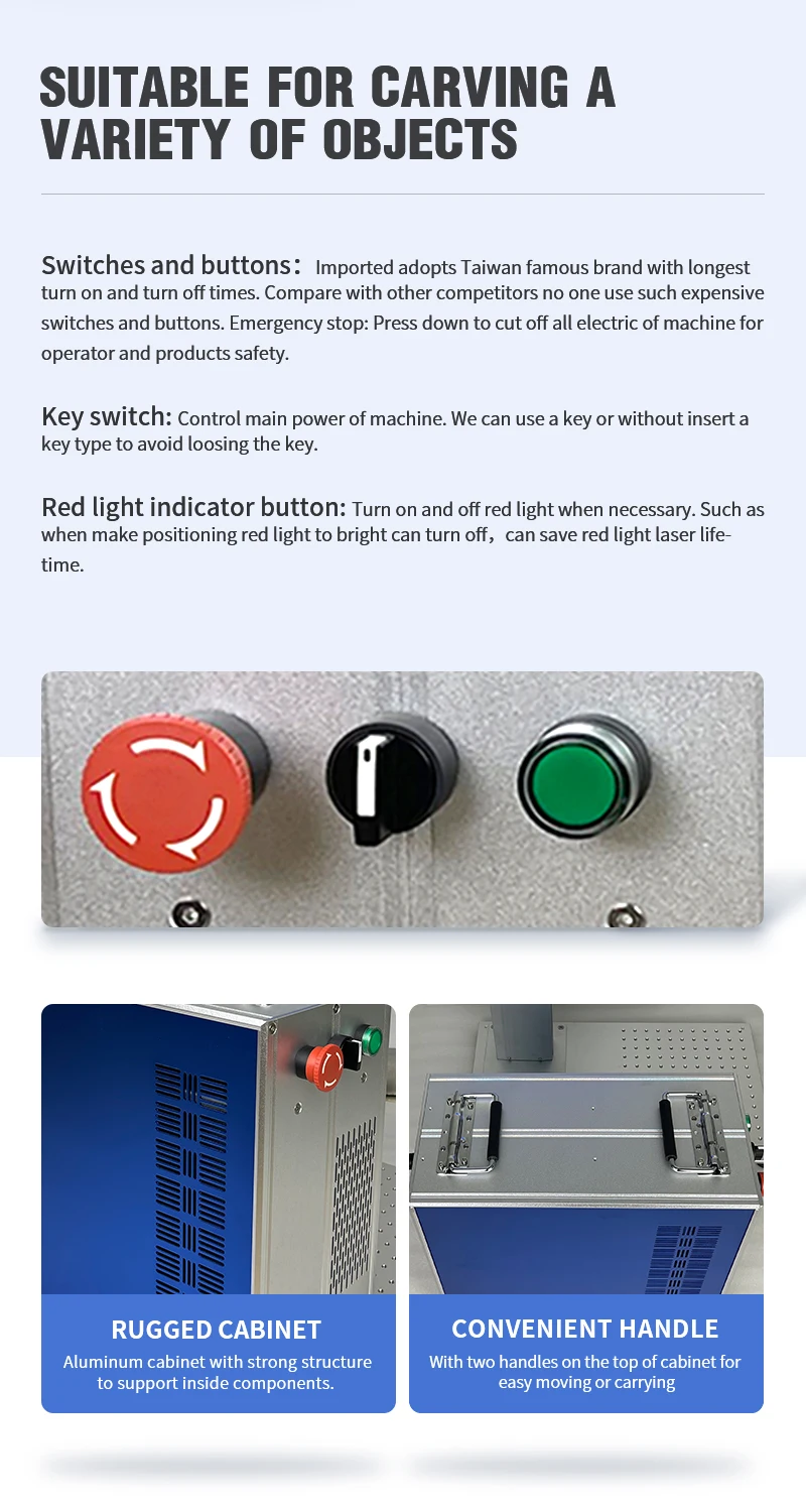 Переключатели и кнопки: импортированные из Тайваня известные бренды с самым длинным временем включения и выключения. По сравнению с другими конкурентами никто не использует такие дорогие переключатели и кнопки. Аварийная остановка: нажмите вниз, чтобы отрезать все электрические машины для безопасности оператора и продуктов. Клавишный переключатель: Управление основной мощностью машины. Мы можем использовать ключ или без вставки типа ключа, чтобы избежать потери ключа. Красный светильник Кнопка индикатора: включить и выключить красный светильник при необходимости. Например, когда вы делаете позиционирование красный светильник яркий может выключить, может сохранить красный светильник срок службы лазера.Алюминиевый шкаф с прочной структурой для поддержки внутренних компонентов. С двумя ручками на верхней части шкафа для легкого перемещения или переноски.