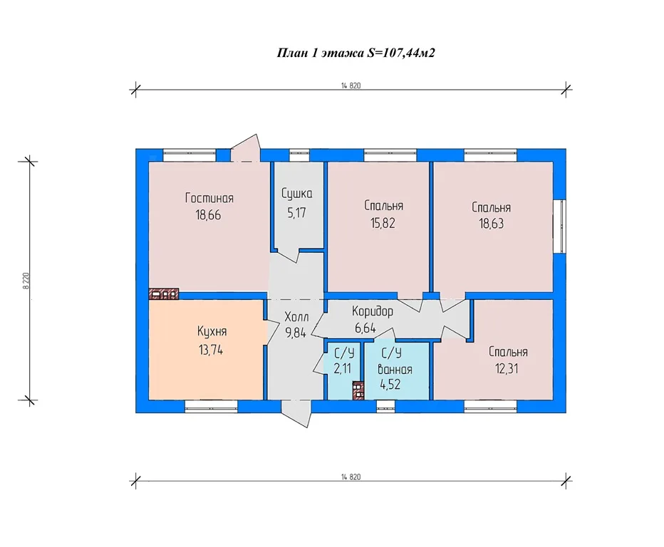 Проект жилого дома дома SD-proekt 11-0004 (107,44 м2, 14,82*9,1 м, керамический блок 440 мм, облицовочный кирпич)
