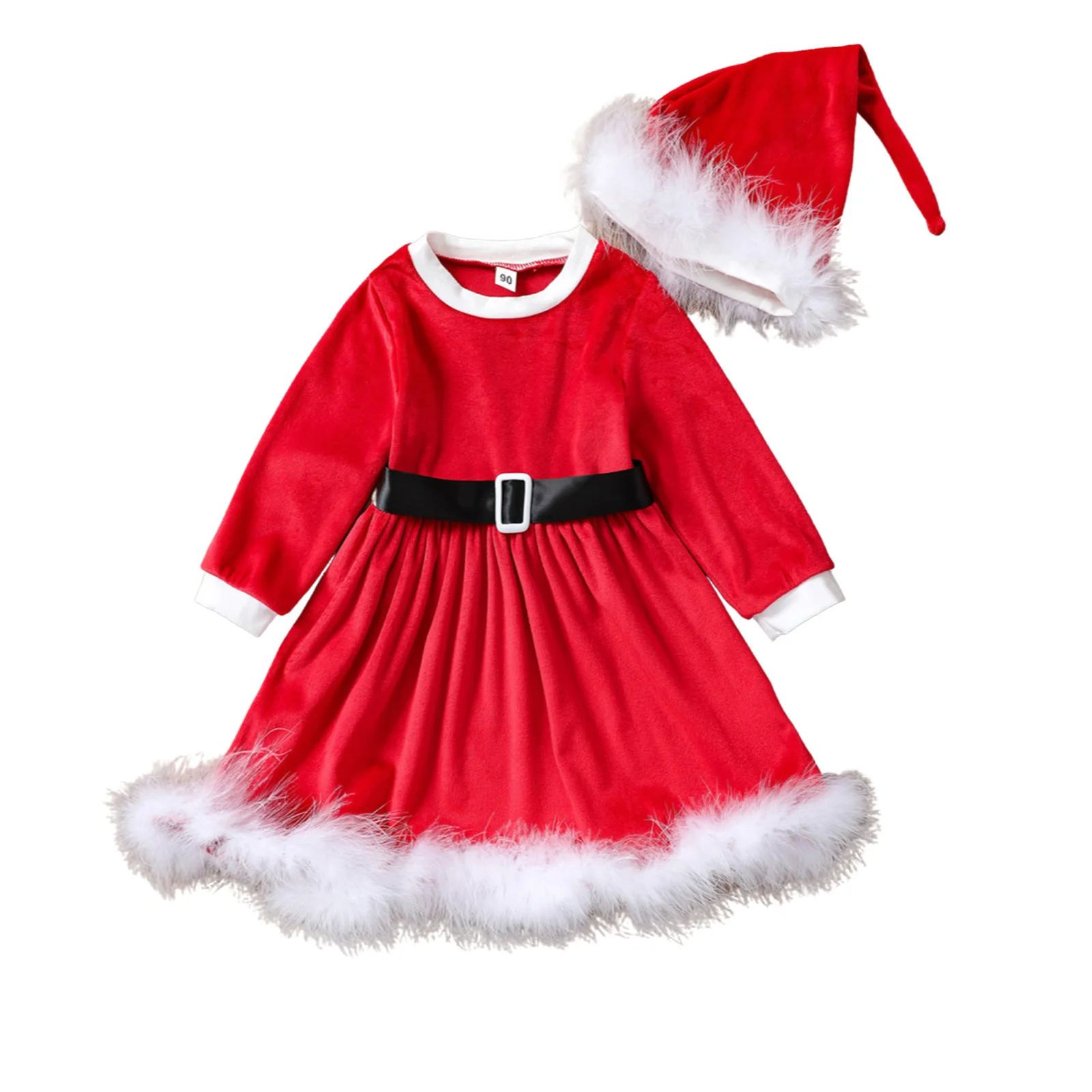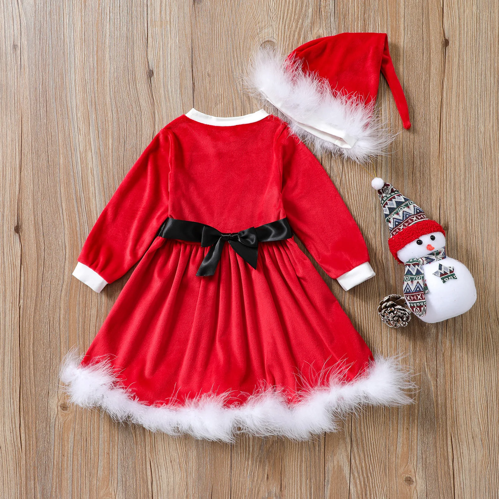 Рождественское платье с длинным рукавом для маленьких девочек + шапка, украшение с поясом, плюшевая пушистая одежда, модные рождественские платья