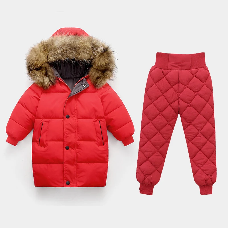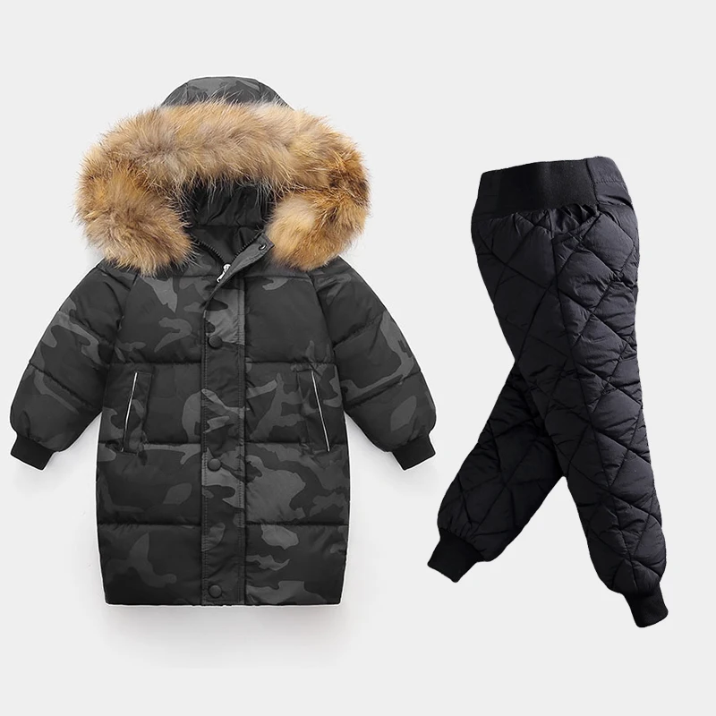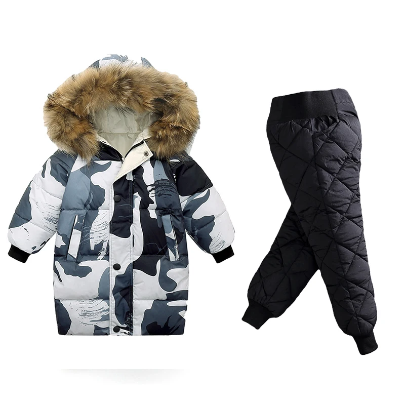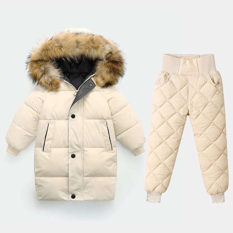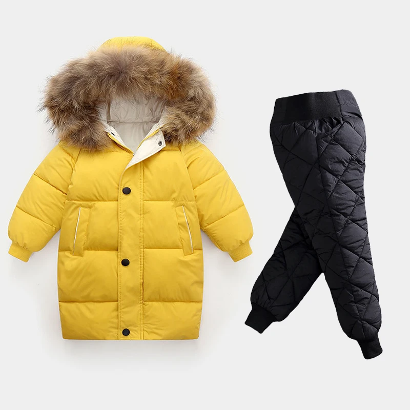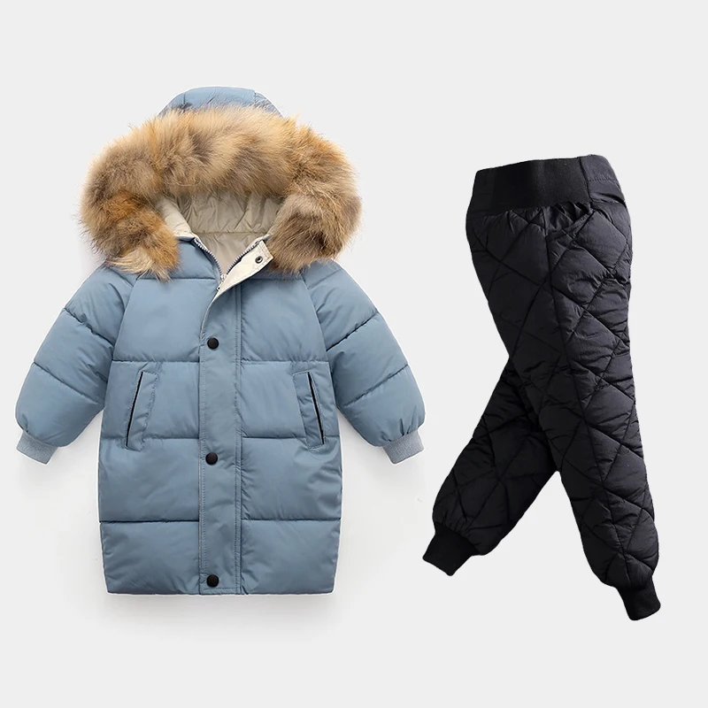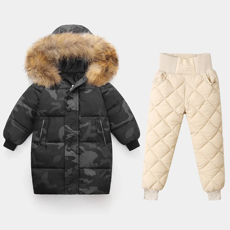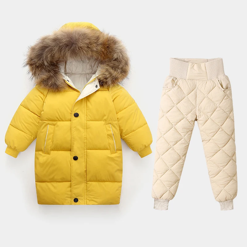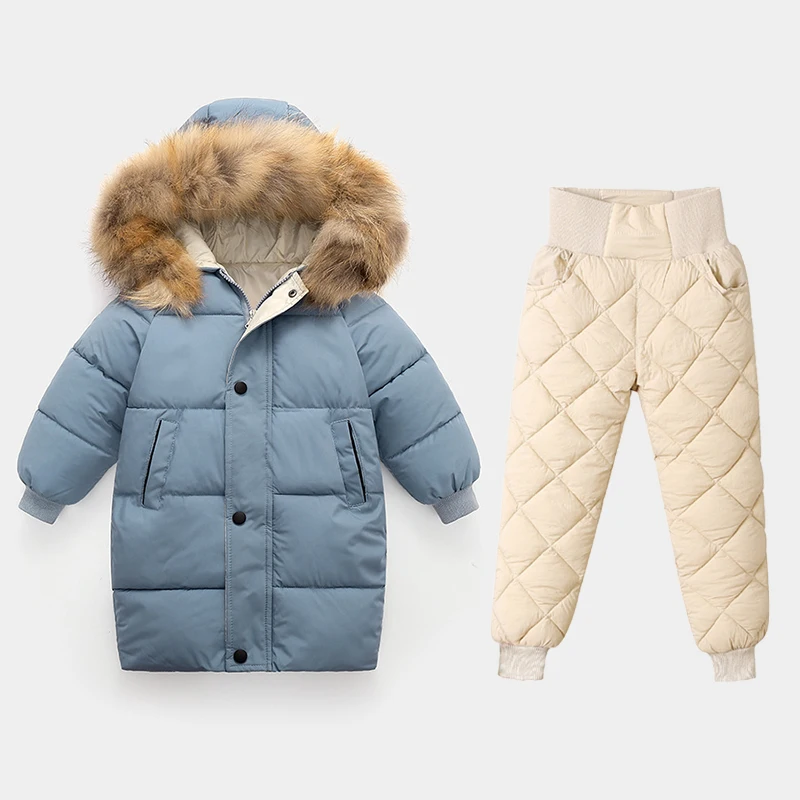 Модный Зимний пуховик для мальчиков и девочек, комплекты одежды для мальчиков, теплая куртка средней длины + штаны, детская одежда из 2 предметов, куртка с пушистым капюшоном унисекс