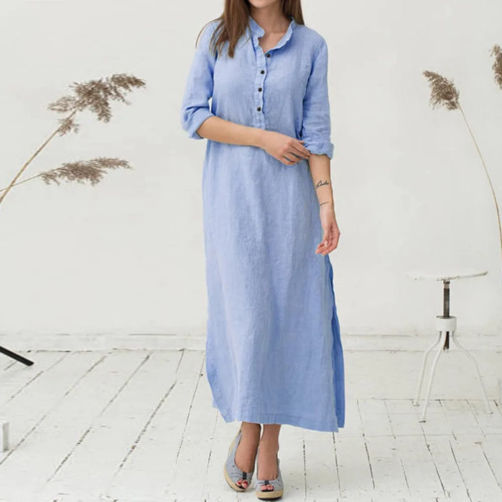 Платье женское длинное из хлопка и льна, кафтан с длинным рукавом, однотонное Повседневное платье-рубашка оверсайз с лацканами, на пуговицах