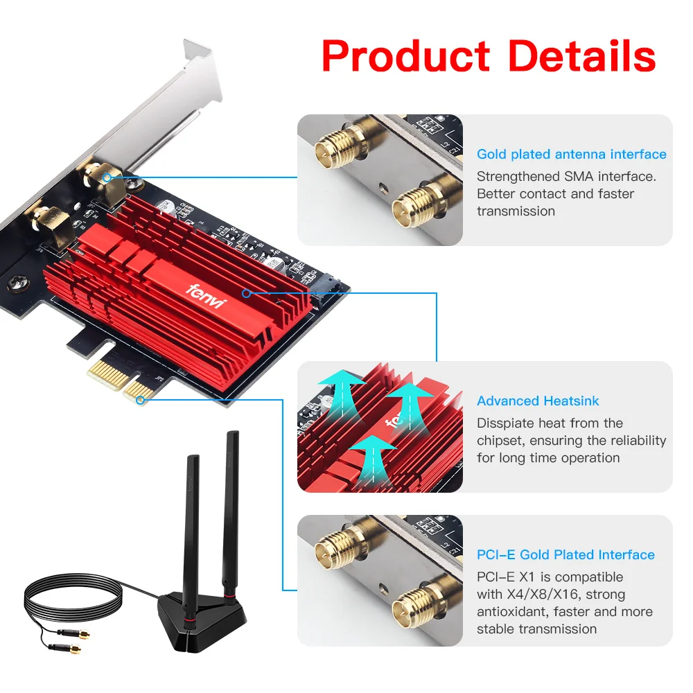 1. Бренд: fenvi2. Модель: FV-AXE3000Pro3.Chipest: чипсет Intel AX2104. Новый Wi-Fi с Blutetooth 5,25. Стандарт IEEE: 802.11ax/ac/a/b/g/n6.Dual Band 2,4 ГГц-300 Мбит/с/5Ghz-2400Mbps7. Примечание: скорость до 2400 Мбит/с (маршрутизатор должен поддерживать 802.11ax)8. Поддержка MU-MIMO9. Операционная система: поддерживает только Windows 10*64 бит и Linux10. Совместимость с: почти компьютером с PCI Express (разъем PCI-E 1X/4X/16X)11. Специально разработанный радиатор обеспечивает стабильную и надежную непрерывную работу12.6DBi антенны с высоким коэффициентом усиления получают лучший прием сигнала13. Загрузка драйвера: вы можете загрузить драйвер на веб-сайте fenvi или попросить нас.