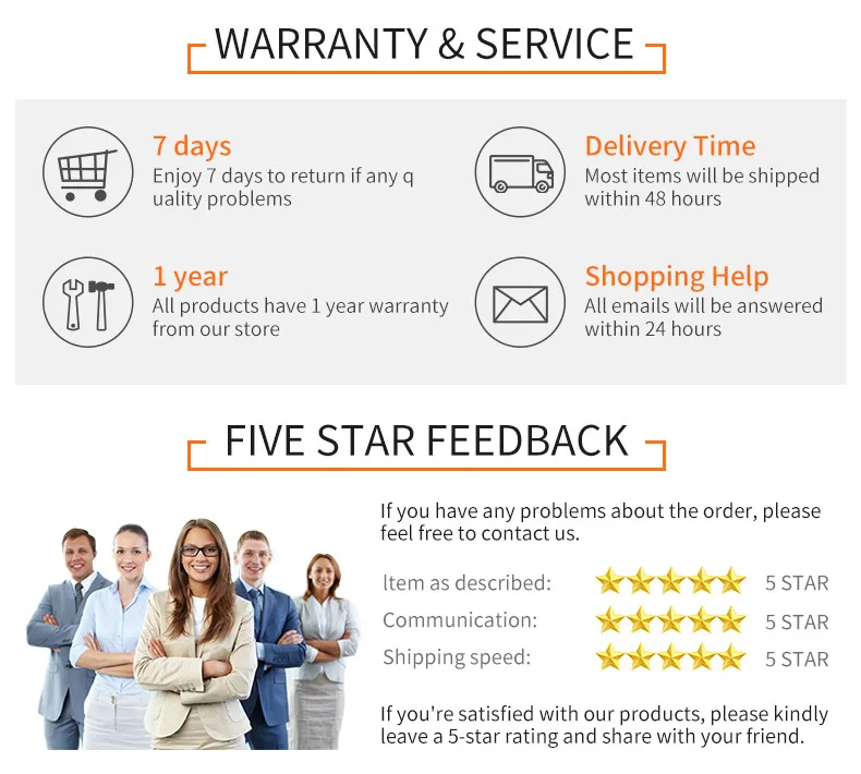 (1) Если вы удовлетворены нашей продукцией, пожалуйста, дайте нам хорошие отзывы со всеми 5 звездами, ваша поддержка является самой большой мотивацией для нас.(2) Если у вас есть какие-либо проблемы с нашими товарами или услугами, пожалуйста, сначала свяжитесь с нами, прежде чем оставить отрицательный отзывы. Мы решим вашу проблему и предоставим вам лучшие услуги клиентов.