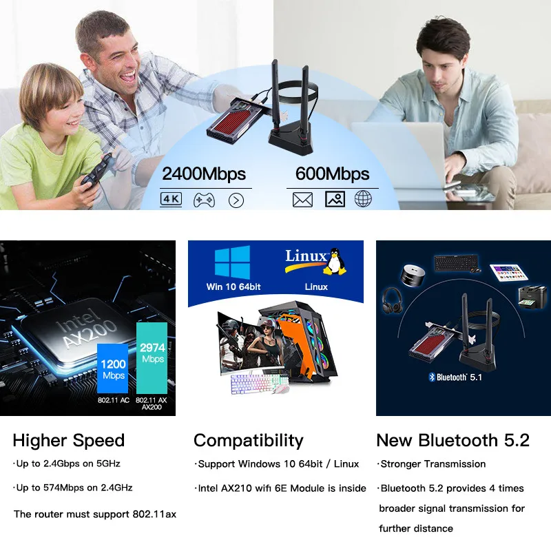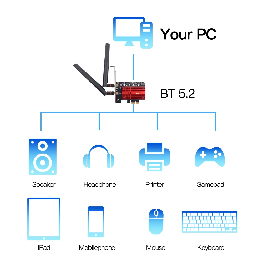 1. Бренд: fenvi2.Chipest: чипсет Intel AX210;3. Модель: FV-AXE3000S PCI-E PC wifi адаптер4.Wi-Fi с Bluetooth-compatible5.2;5. Стандарт IEEE: 802.11ax/ac/a/b/g/n;6.Dual Band 2,4 ГГц-300 Мбит/с/5Ghz-2400Mbps;7. Примечание: скорость до 2400 Мбит/с (маршрутизатор должен поддерживать 802.11ax);Поддержка MU-MIMO;8. Операционная система: поддерживает только Windows 10*64 бит и Linux;9. Совместимость с: почти компьютером с PCI Express (разъем PCI-E 1X/4X/16X);10 специальный теплоотвод обеспечивает стабильную и надежную непрерывную работу;11.6DBi антенны с высоким коэффициентом усиления получают лучший прием сигнала;12. Загрузка драйвера: вы можете скачать драйвер на веб-сайте fenvi или попросить нас.