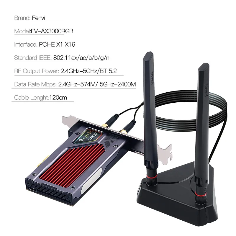 1. Бренд: fenvi2. Модель: FV-AXE3000RGBPCI-E ПК wifi адаптер3.Chipest:Intel AX210Chipset;4. Новый Wi-Fi с Blutetooth 5,2;5. Стандарт IEEE: 802.11ax/ac/a/b/g/n;6.2.4 Ghz-574Mbps/5Ghz-2400Mbps/6Ghz-2400Mbps;7. Примечание: скорость до 2400 Мбит/с на 5G/6 ГГц (маршрутизатор должен поддерживать 802.11ax);8. Операционная система: поддерживает только Windows 10*64 бит и Linux;Поддержка MU-MIMO;9. Совместимость с: почти компьютером с PCI Express (разъем PCI-E 1X/4X/16X);10. Специальная особенность: RGB цветное освещение