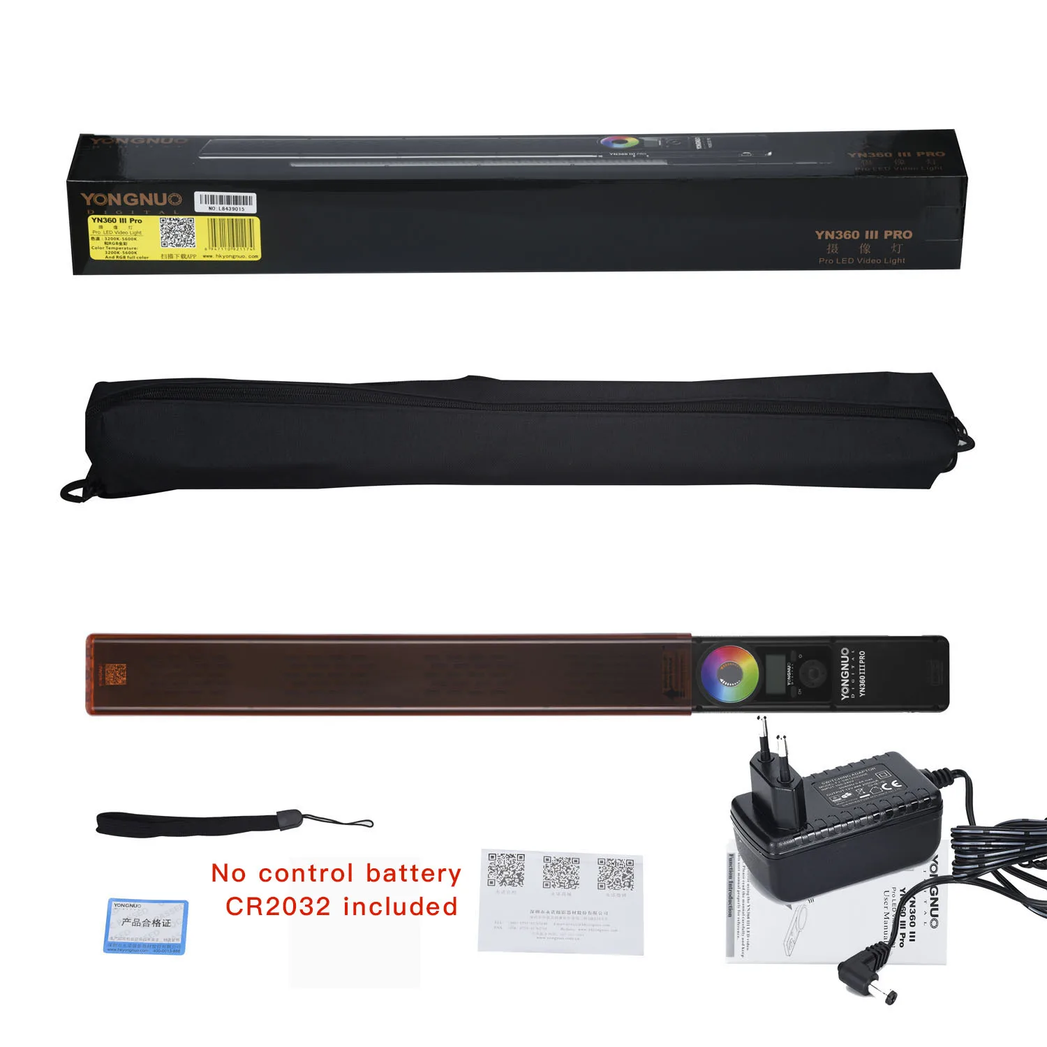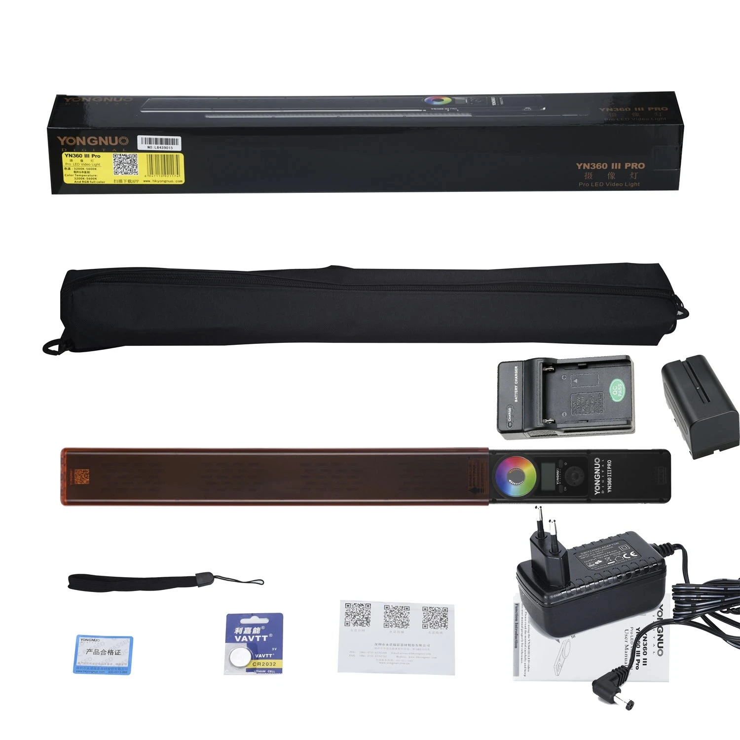 Цветовая температура: 3200K,5600K и RGB полный цветИндекс цветопередачи: больше или равен 95Удаленное Расстояние: менее 15 метровМощность: 21,6 Вт и 20 ВтСветовой поток: 2790лмВес: около 80 гУгол освещения: 55 градусов и 110 градусовВнешний источник питания постоянного тока: 12 В 2 а постоянного токаРазмер: 583*48*24 ммДве модели YN360III Pro на ваш выбор, белый цвет-состоит из 360 ламповых бусин 5600K и 60 RGB SMD светодиодов, био-цвет-состоит из 180 ламповых бусин 3200K и 180 ламповых бусин 5600K и 60 RGB SMD светодиодов.