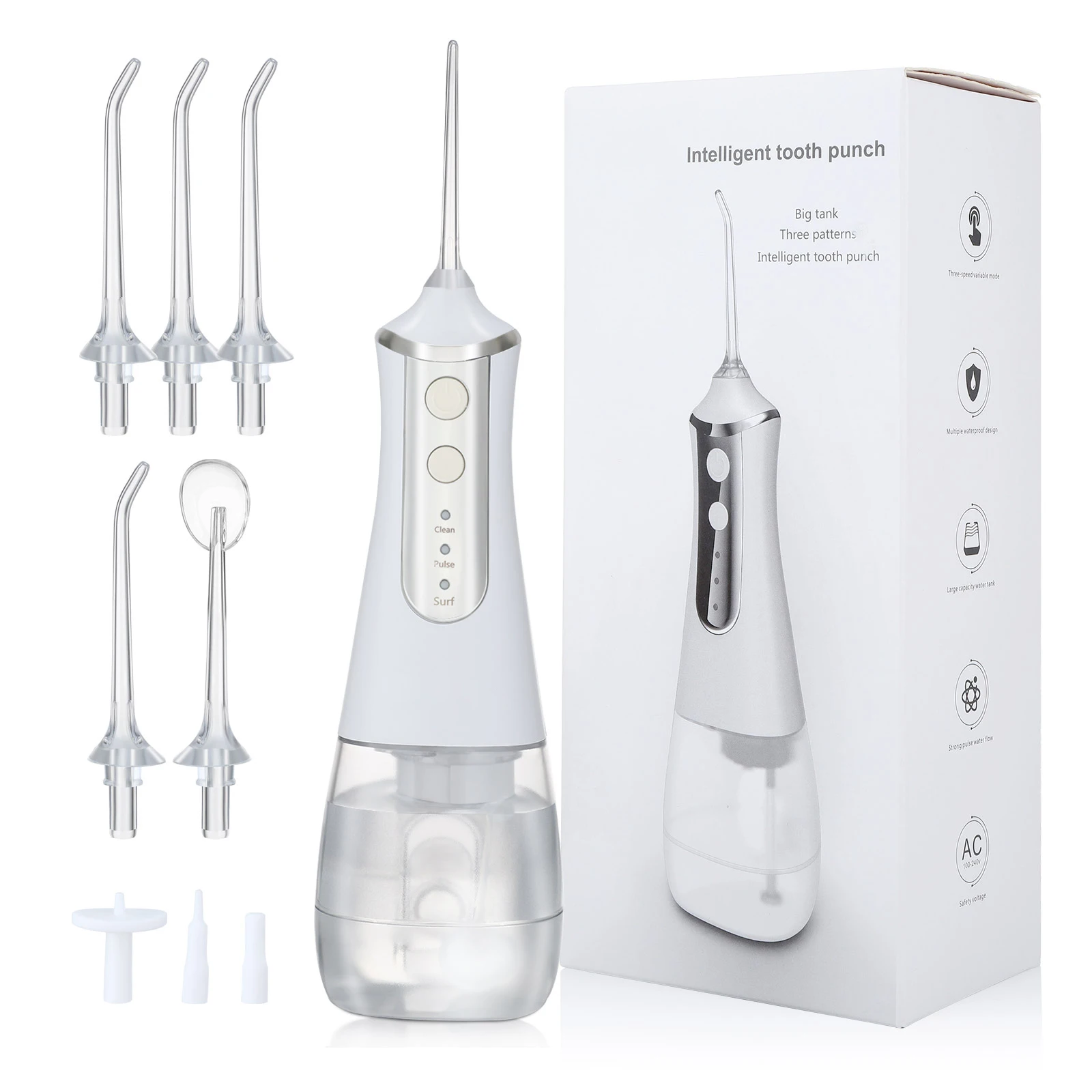 1) межзубный массаж, чистый рот, сильный пульс, вся машина является водонепроницаемой. Профессиональный уход и чистка, решение различных проблем с полостью рта, чистка между зубами без остатка2) гравитационный шар поглощает воду, брызгозащищенный силиконовый чехол, емкость емкостью 300 мл большой воды, три режима можно переключать по желанию:3) деликатный режим: нежное давление воды, подходит для новичков и людей с чувствительной полости рта4) режим высокого давления: высокое давление воды, Эффективная очистка, подходит для большинства людей5) импульсный режим: импульсное давление воды, можно массировать десны, буферизировать мытье всего тела6) Частота импульса: первая шестерня 1400 вторая Шестерня 1000 Третья шестерня 1100