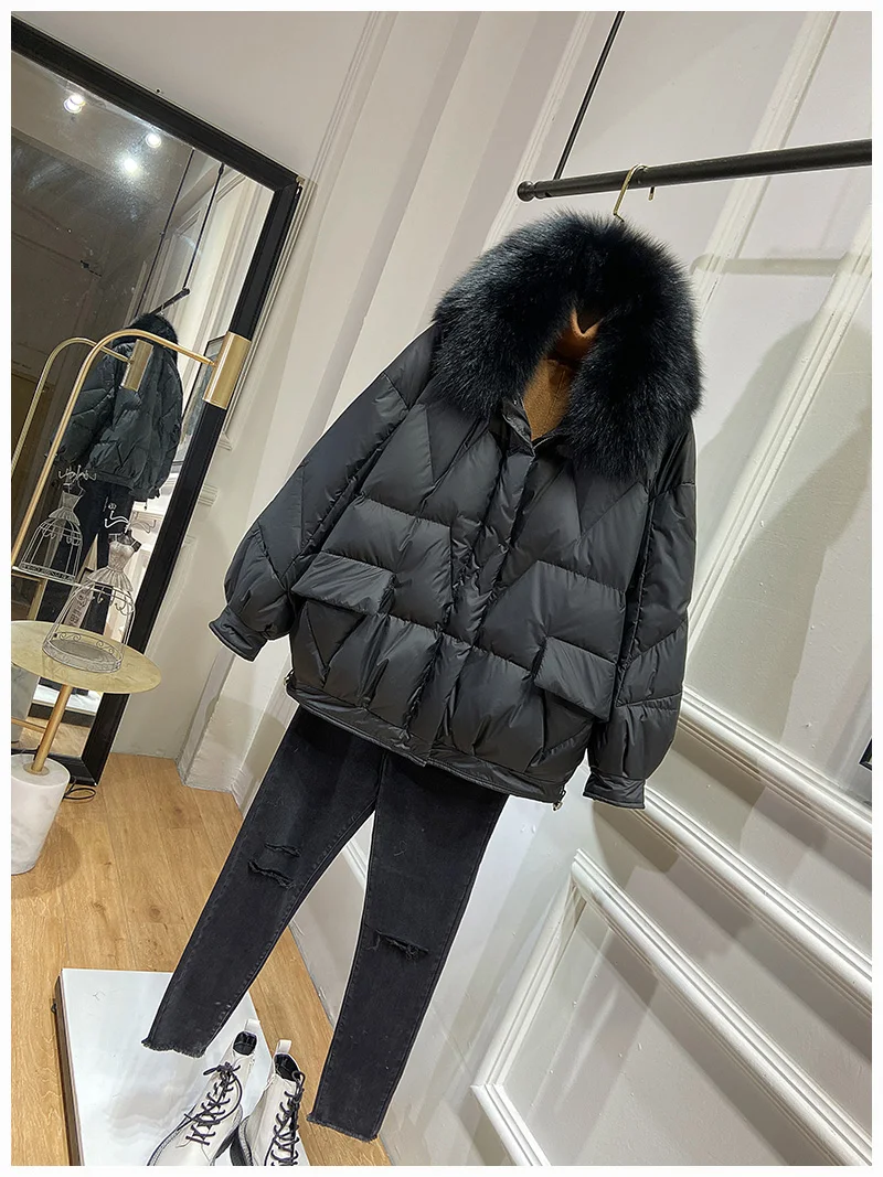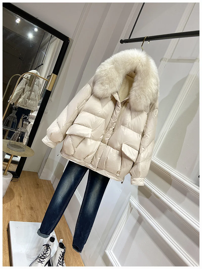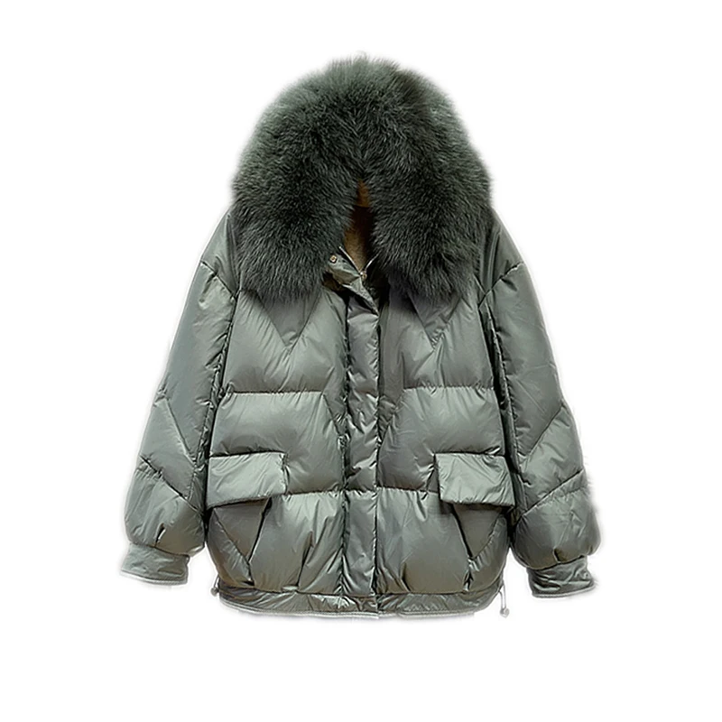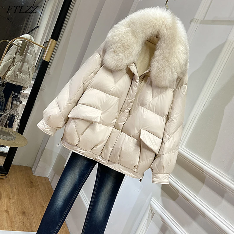 Пуховик женский зимний с воротником из искусственного лисьего меха, 90% Пух белой утки