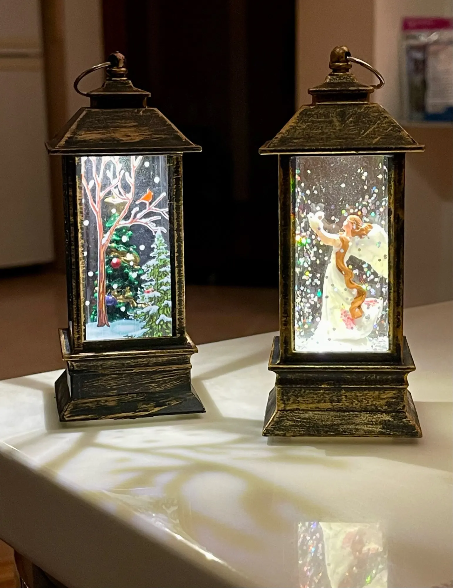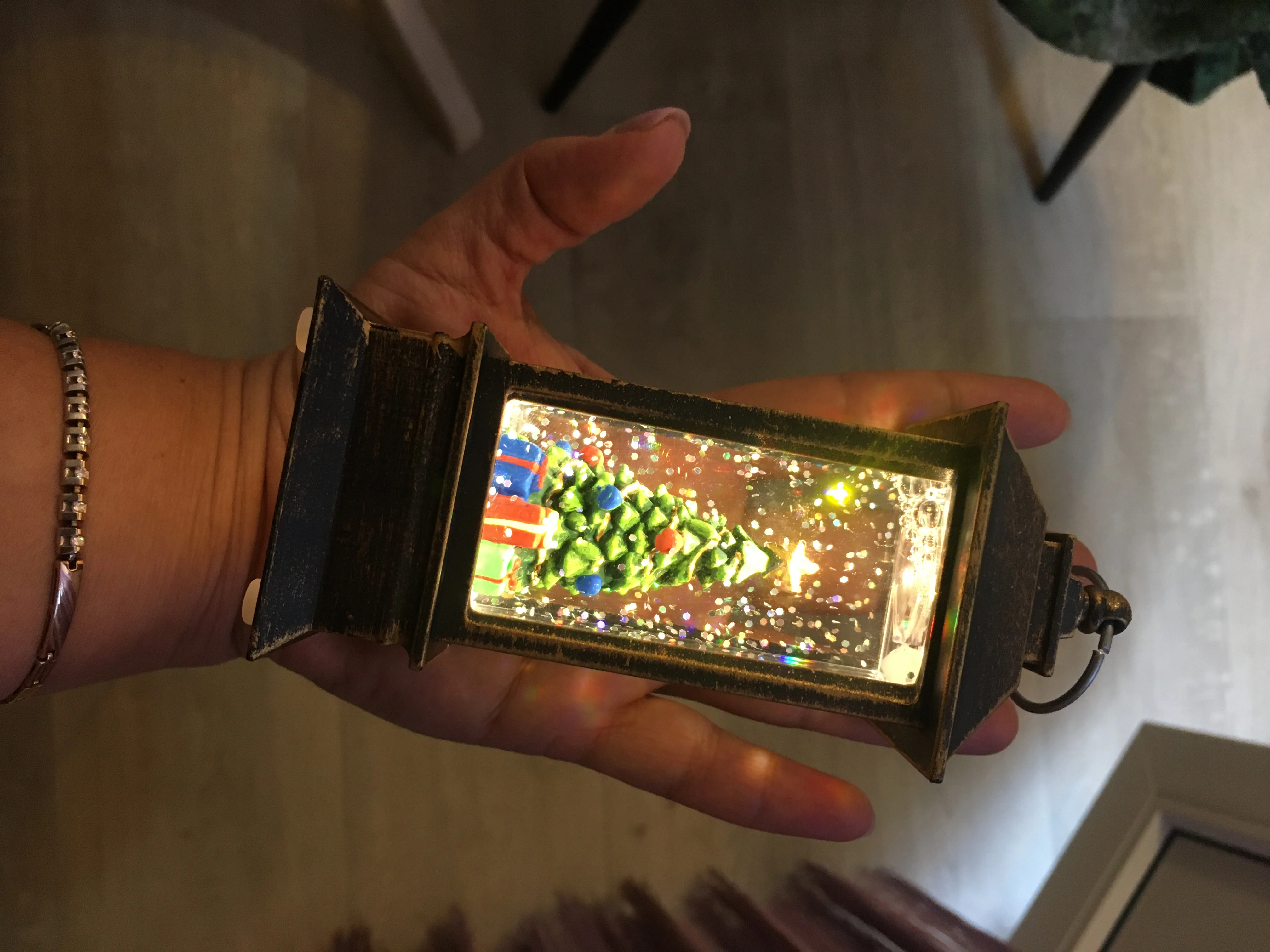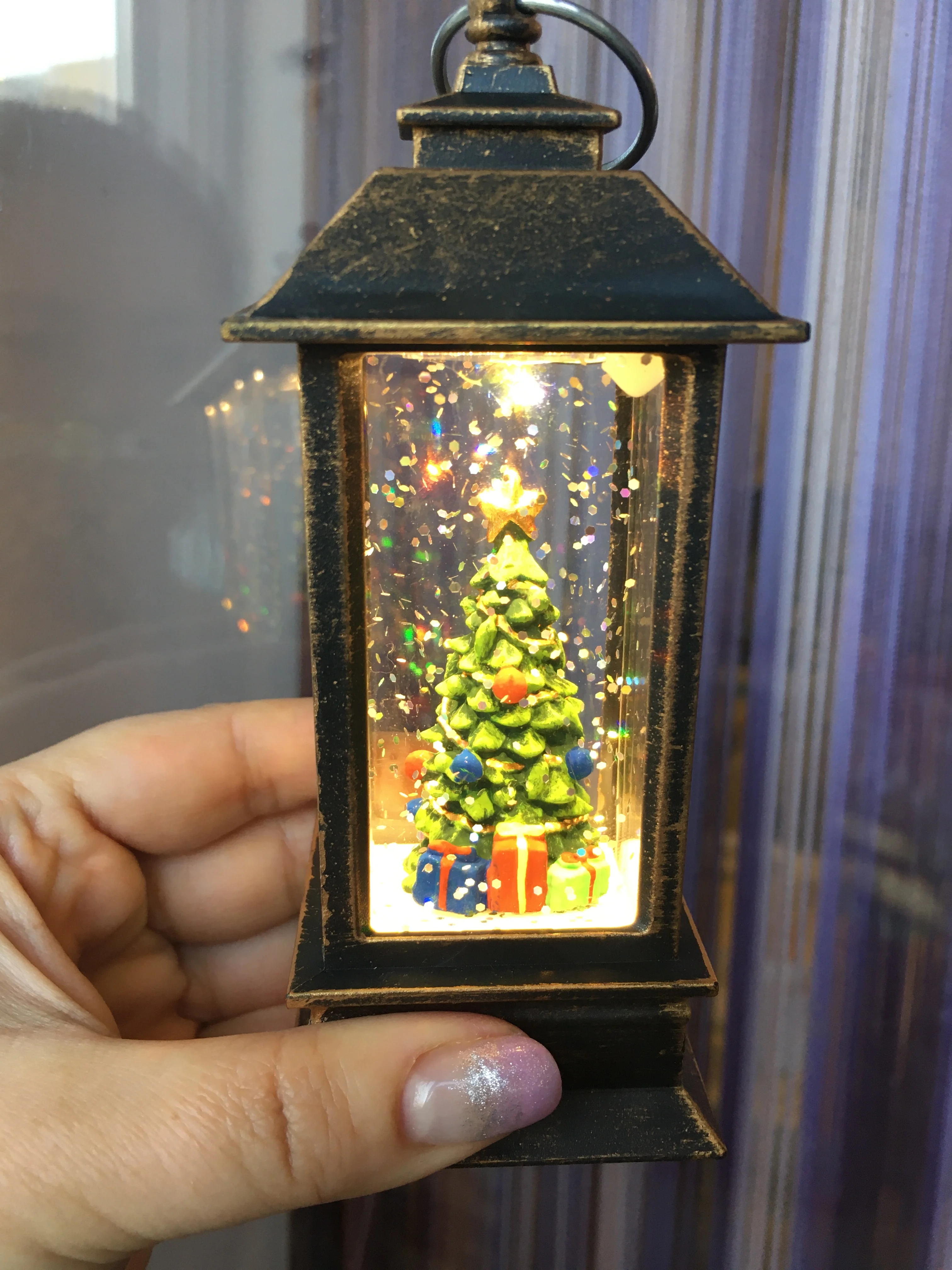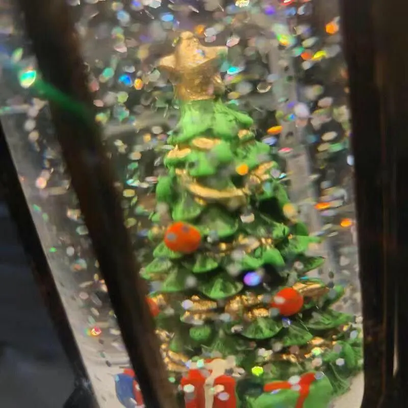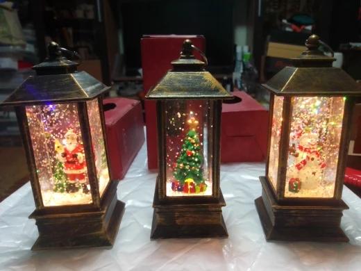 Мне очень нравится фонарь, и он действительно хорошо выглядит. Фонарь маленький, свет теплый, а крохотный клубящийся снег кажется золотистым. Он с переключателем внизу, его нужно поднять, чтобы выключить и включить. Я купил фонарь со снежной сценой в прошлом году, и он мне так понравился, что я заказал фонарь с елкой.