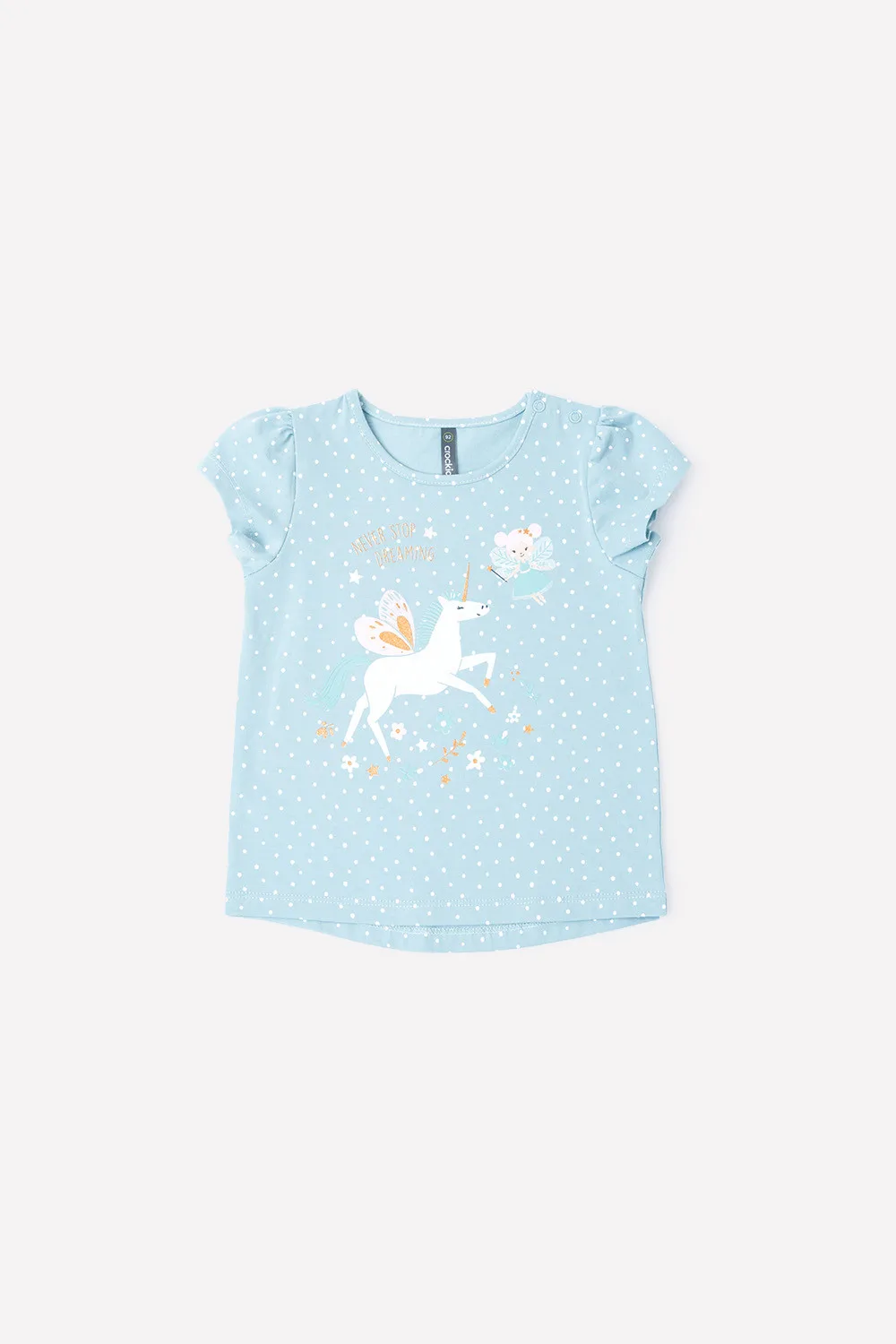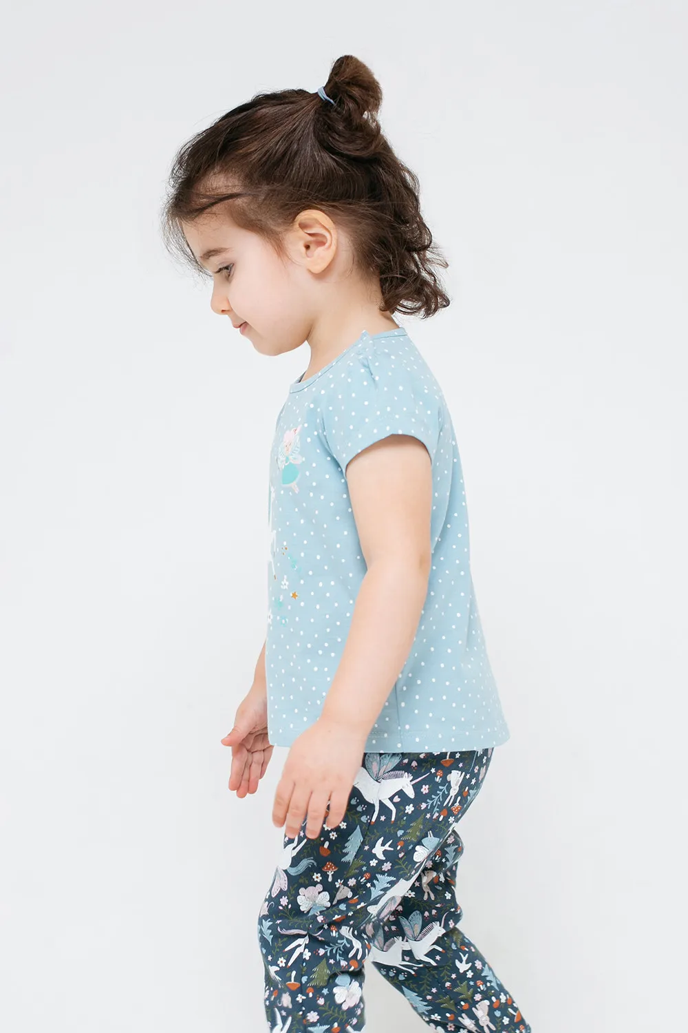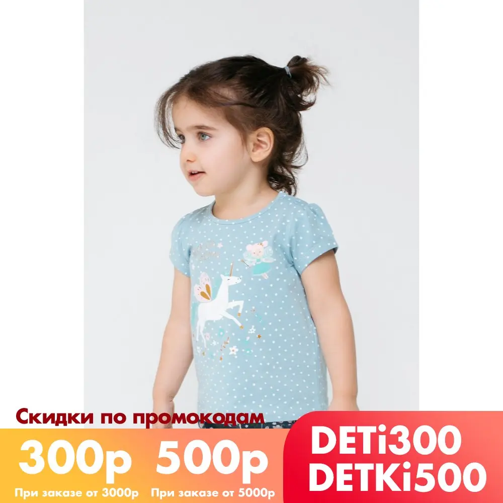 Описание: Футболка с короткими рукавами из лёгкого трикотажа супрем. Украшена набивными горошками и принтом на полочке. Для удобства при одевании застёгивается на плече с помощью кнопок.