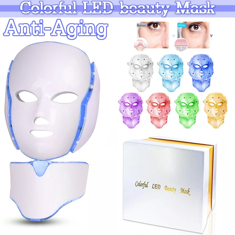 Светящаяся светодиодная маска для лица, 7 цветов, для шеи, фотонной терапии, для отбеливания лица