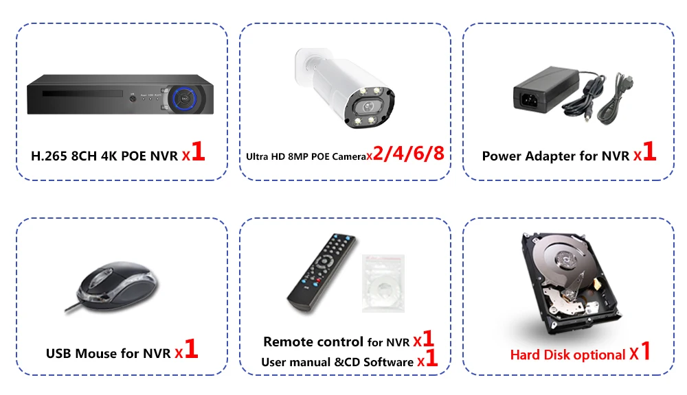 1 сетевой видеорегистратор H.265 8CH 4K & 8MP POE NVR;2/4/6/8 X H.265 HD POE аудио 8.0MP IP камера для дома и улицы ИК Ночного Видения Всепогодные камеры;1 x Блок питания для NVR;1 х USB мышь для NVR;1 компакт-диск программного обеспечения для NVR;1 пульт дистанционного управления для NVR;Жесткий диск опционально!