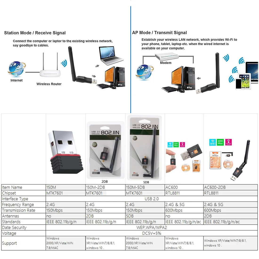 * Адаптер wifi, интегрированный с программой беспроводной конфигурации, прост в установке и использовании. Можно легко и быстро настроить беспроводного клиента. Поддержка мягких функций AP, удобна для быстрого создания беспроводной локальной сети (LAN). Что касается беспроводной безопасности, он поддерживает WPA/WPA2/WEP/802.1X/WMM.
