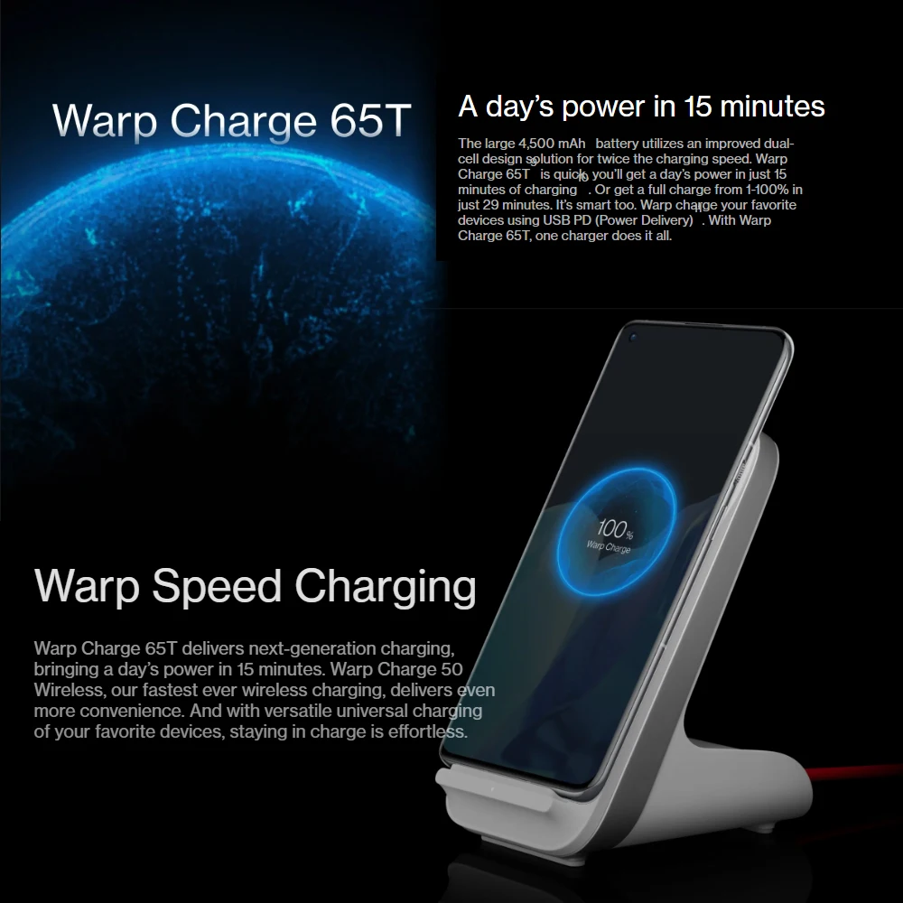 Warp Charge 65T обеспечивает зарядку следующего поколения, обеспечивая питание в течение 15 минут. Warp Charge 50 Wireless, наша самая быстрая Беспроводная зарядка, обеспечивает еще больше удобства. И с универсальной зарядкой ваших любимых устройств, оставаться в зарядке без усилий