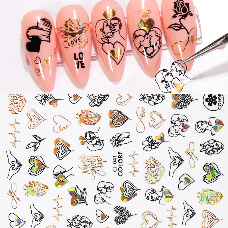 3D наклейки для ногтей в форме сердца, любви, лазерная Золотая роза, цветок, снежинка, мультяшная линия, люди, слайдер, дизайн, лак, наклейки для ногтей, дизайн ногтей, Декор
