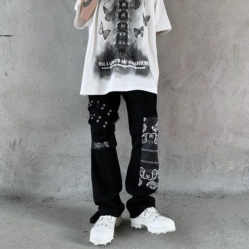 Джинсы-карго мужские прямые с принтом пейсли, винтажная уличная одежда, модные свободные готические брюки с соединением, с завышенной талией, в Корейском стиле
