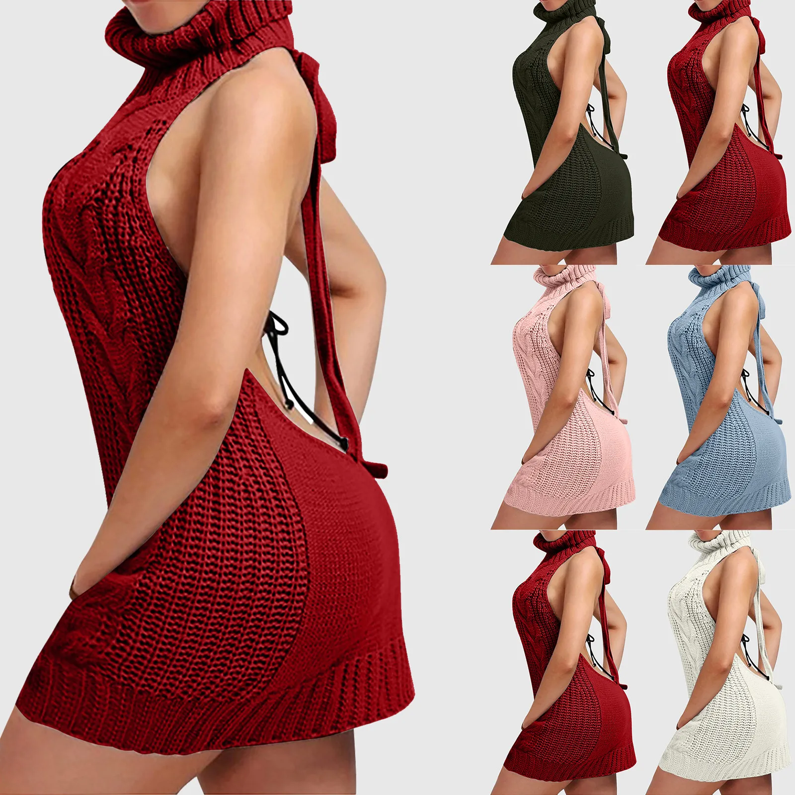 Женский свитер, пуловер, привлекательный Однотонный свитер без рукавов с открытой спиной и высоким воротником