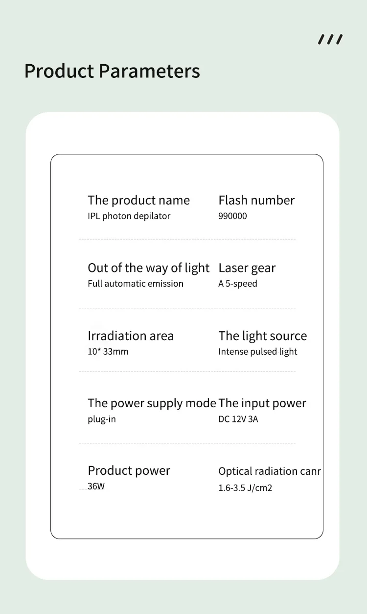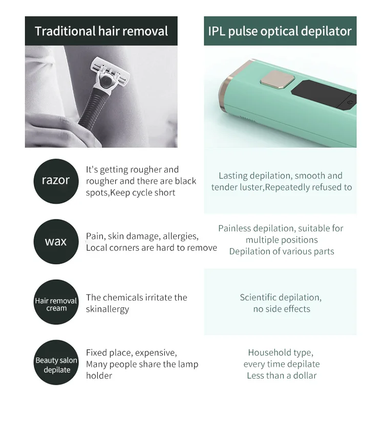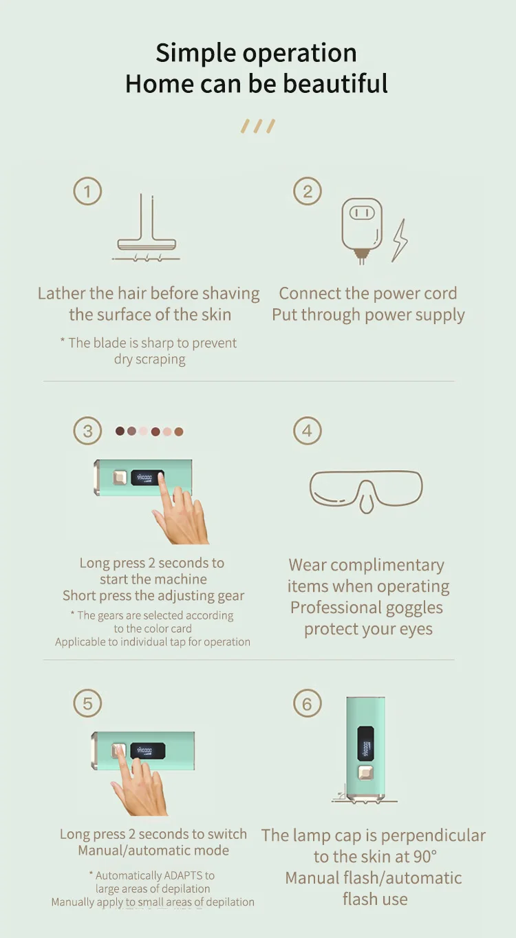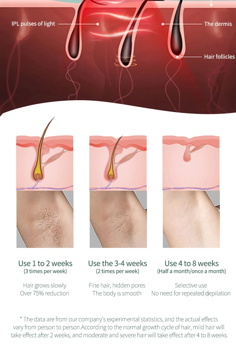 Постоянное удаление волос: IPL устройство для удаления волос позволяет волосяным фолликулам спать и ломает цикл роста волос. В результате происходит постоянное удаление волос и постоянная гладкая кожа.Безболезненный и нежный: он излучает теплый светильник, и уровень дискомфорта очень минимальный. Ipl лазерная система удаления волос очень мягкая, особенно для первых пользователей или работает на нежных областях, таких как лицо или Линия бикини.Экономичное домашнее решение: адаптировала технологию для эффективного и эффективного использования в комфорте вашего дома. По сравнению с затратами на методы удаления волос в салоне, это не займет много времени, чтобы увидеть материальную выгоду от этого домашнего IPL устройства.Что ожидать: 90% уменьшение волос в течение 6-12 недель в течение 3 месяцев. Продолжительное ежемесячное лечение или лечение по мере необходимости должны поддерживать вашу кожу с постоянным уменьшением волос в домашних условиях.Лучший IPL лазерная эпиляция устройство поставщика: продукты и Услуги приходят напрямую от производителя с 18-летним опытом в поставке оборудования для салонов красоты и клиник. Гель не нужен. С очками.Безопасные технологии, эффективные результаты, безболезненные.Что ожидать: в первые несколько недель после первоначального лечения вы все равно увидите рост волос. Это, скорее всего, волосы, которые были пропущены во время лечения, т. Е. Они лежали в спящем состоянии, а не в фазе роста во время лечения; Когда IPL является наиболее эффективным.6 недель в 12-недельный план: Вы должны увидеть снижения роста волос. Однако многие волоски, возможно, все еще не обработаны в своей фазе роста. Важно продолжать еженедельные процедуры.После того, как 12-недельный планСразу после того, как вы завершили план на 12 недель, вы должны увидеть значительное сокращение волосков в обработанной области. Остальные волосы должны быть более тонкими и светлыми по цвету. Непрерывное ежемесячное лечение или лечение по мере необходимости должны поддерживать вашу кожу с постоянным уменьшением волос в домашних условиях.