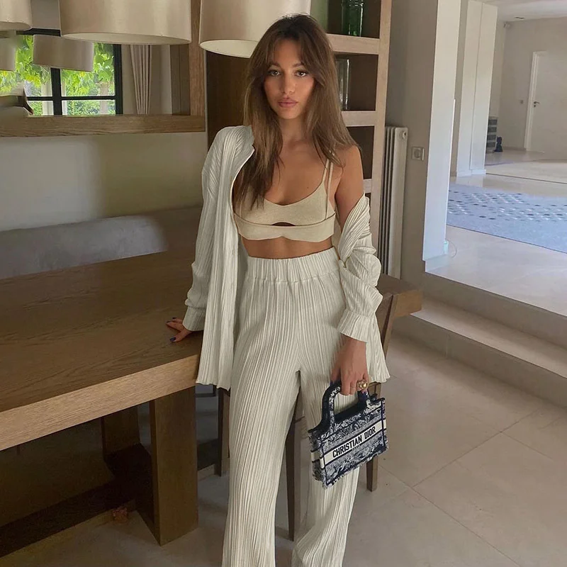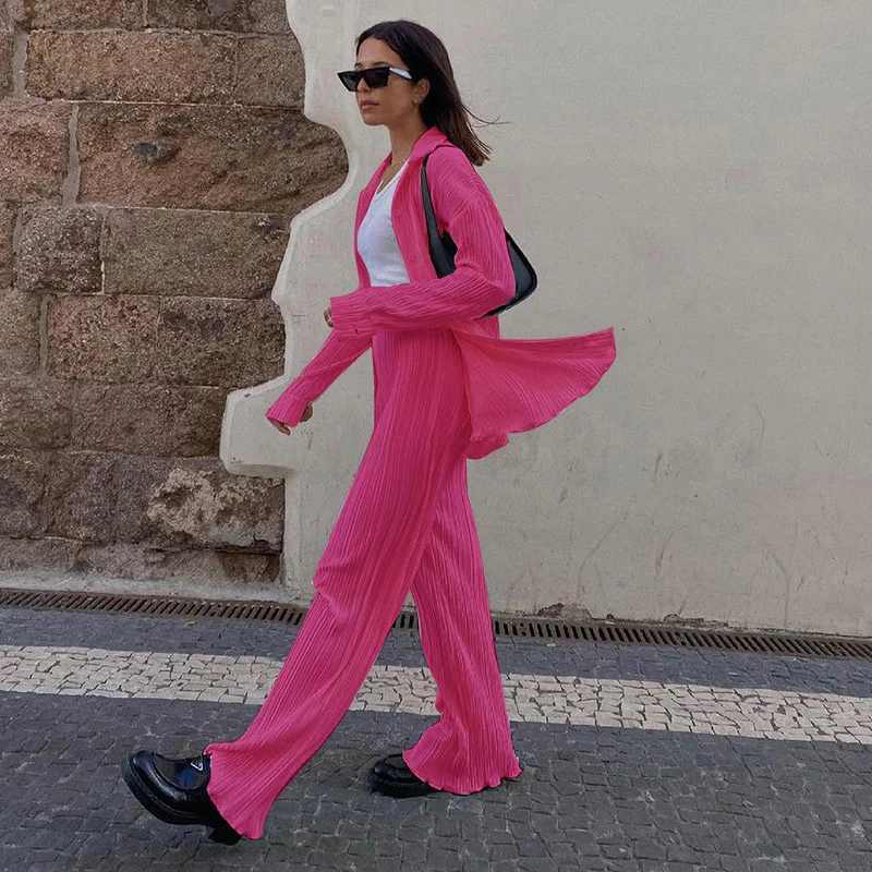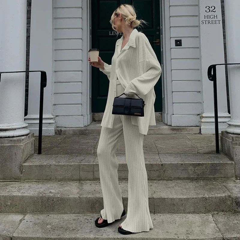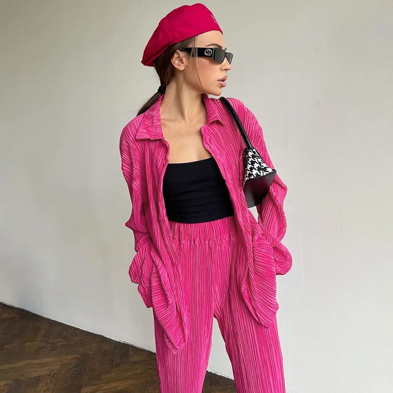 Женский Повседневный плиссированный комплект из двух предметов, осенний спортивный костюм, Свободный кардиган с лацканами и брюки с широкими штанинами, однотонные женские костюмы для женщин