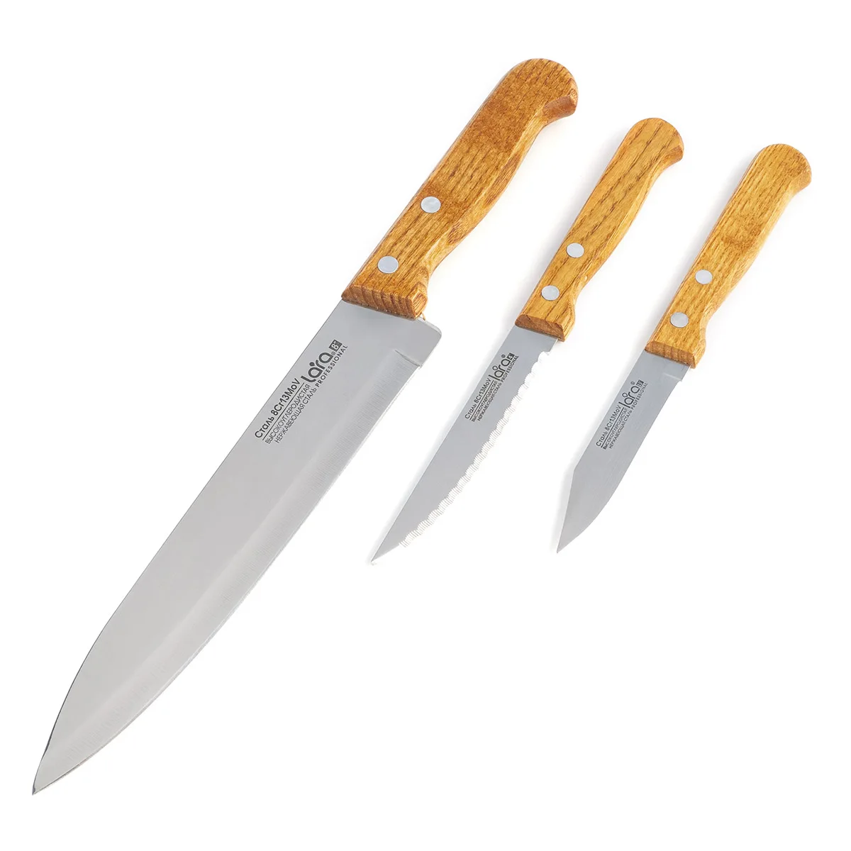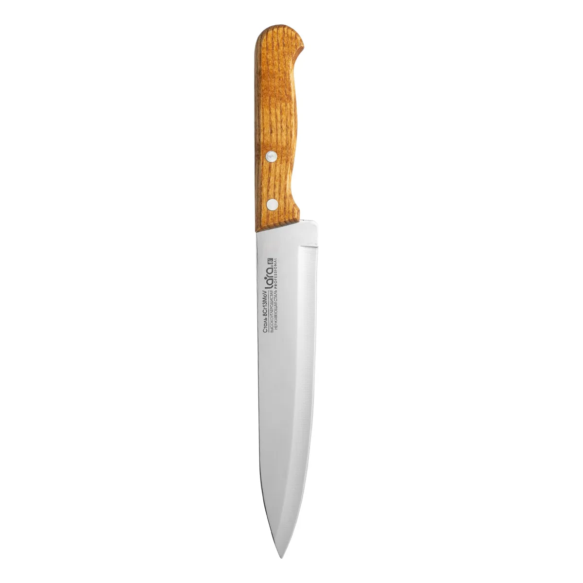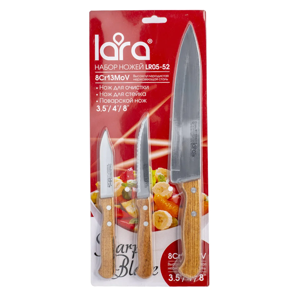 Набор ножей Lara Предназначен Для Любителей мяса и включает в себя три типа: нож для стейка, Овощечистка и нож шеф-повара. Набор позволит вам завершить любую кухню с отличными инструментами для резки и обработки овощей, мяса или рыбы. РекомендуетЯ ручная стирка. Лезвие каждого ножа изготовлено из высокоуглеродистой нержавеющей стали класса 3cr13 с зеркальной полировкой. Лезвие устойчиво к коррозии, и идеальное острое острие режущей кромки будет оставаться острым в течение длительного времени. Мусат, точильный камень или нож помогут с легкостью заточить лезвие. Удобная износостойкая ручка из натурального бука усилена заклепками и устойчива к влаге.