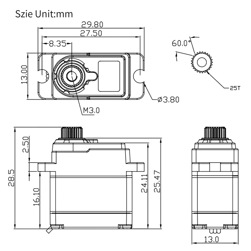 И выходные зубцы используют сервопередачи стандартного размера с металлическими зубьями 25T.