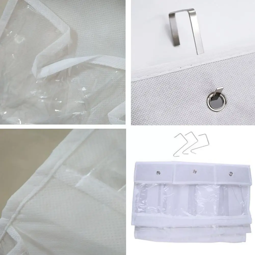 Описание100% новое высокое качествоМатериал: Нетканая ткань + прозрачный ПВХ + картон + металлЦвета: белый, черныйРазмер: 150 см * 45 смПримечание: данная модель подходит для двери толщиной менее 4,2 смОсобенности:Держатель для хранения обуви, который можно повесить за дверь. Подвесная полка для хранения вещей может сэкономить место для обуви.Легко устанавливается, с крючками, не требуется аппаратное обеспечение, готово к удалению и установкеОрганайзер для обуви на двери защищает обувь или предметы от пыли и повреждений. Держатель сумки для хранения, висящий на двери, идеально подходит для организации обуви, аксессуаров для красоты, мелких предметов и т. д.Настенный органайзер для обуви-24 прозрачных кармана для обуви до 12 пар, экономия пространства на полу для лучшего храненияТовары включают:1 * подвесная сумка3 * крючокSPU:SND8548