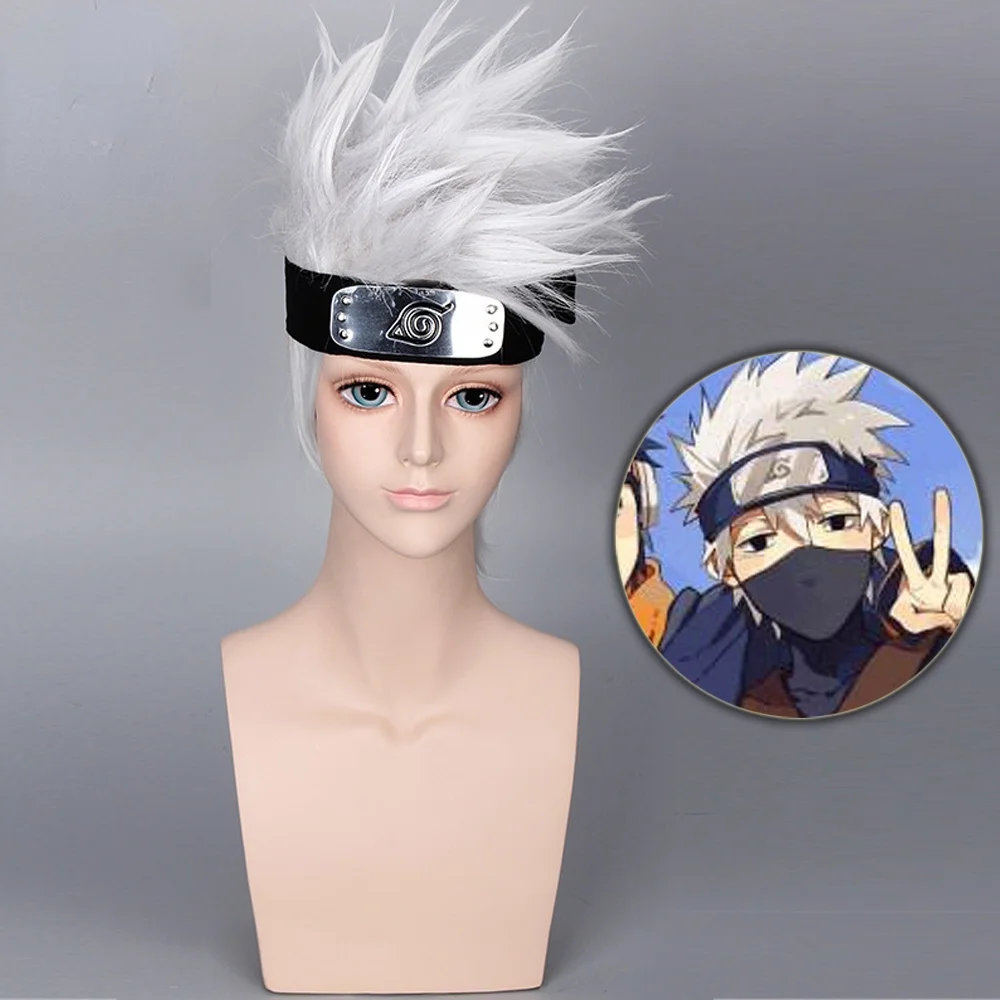 Мужской парик для косплея Какаси Hatake, Короткие термостойкие искусственные волосы серебристого и белого цвета с повязкой на голову и маской