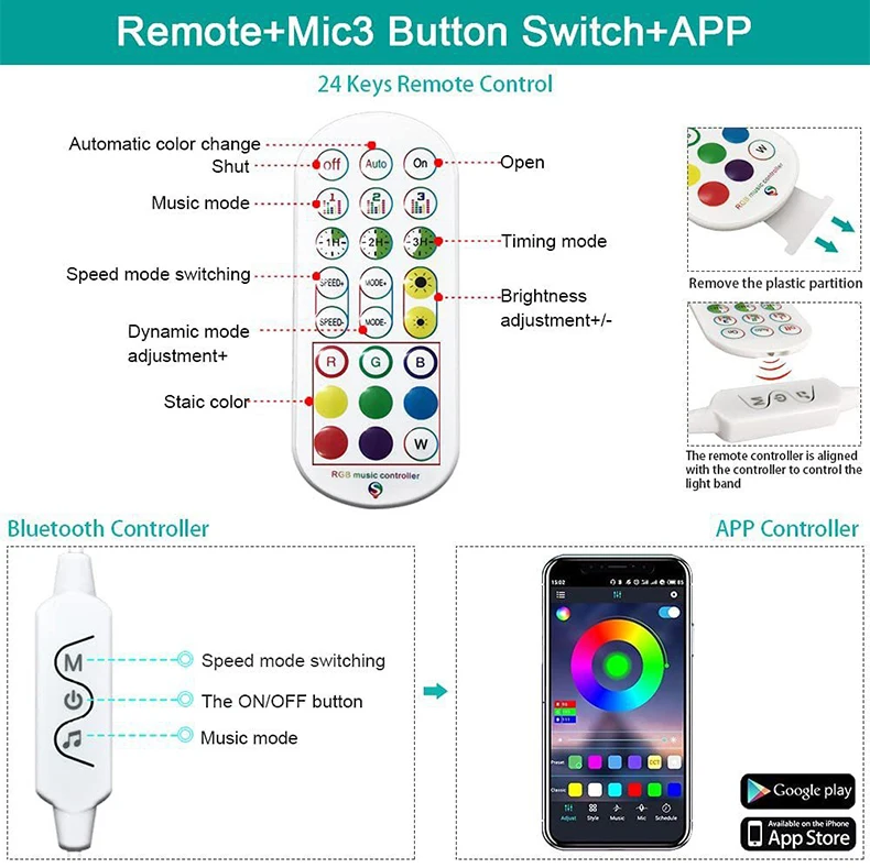 Control methodMobile Phone APP + 24Key Remote Control+3 Key Control