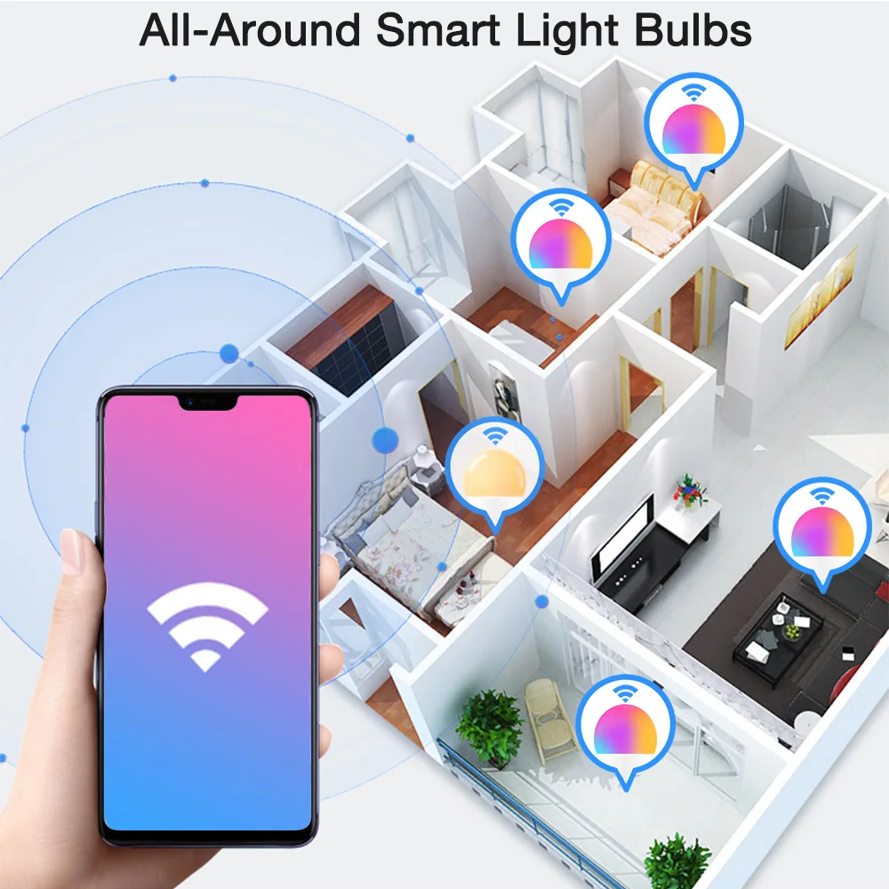 Держите подключив этот Wi-Fi умный светильник лампочка с вашей домашней сети (поддерживает только 2,4 ГГц Wi-Fi), вы можете удаленно Контролируйте умный Светильник лампы на вашем смартфоне имитации в тех случаях, когда вы выходите из дома, В доме есть люди. Функция группового управления позволяет управлять более чем одной умной лампой-светильник одновременно для настройки сцены.
