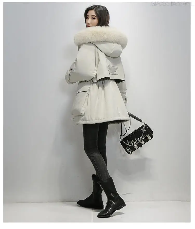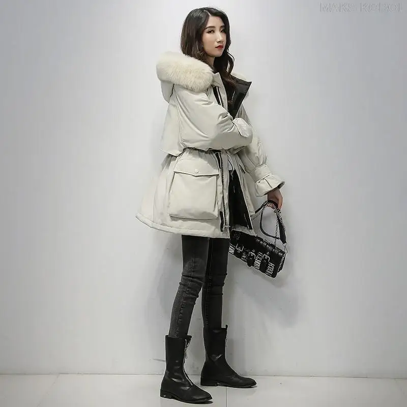 Большая зимняя женская куртка с капюшоном из натурального Лисьего меха, толстые парки на 90% белом утином пуху, теплое зимнее пальто с поясом и завязкой