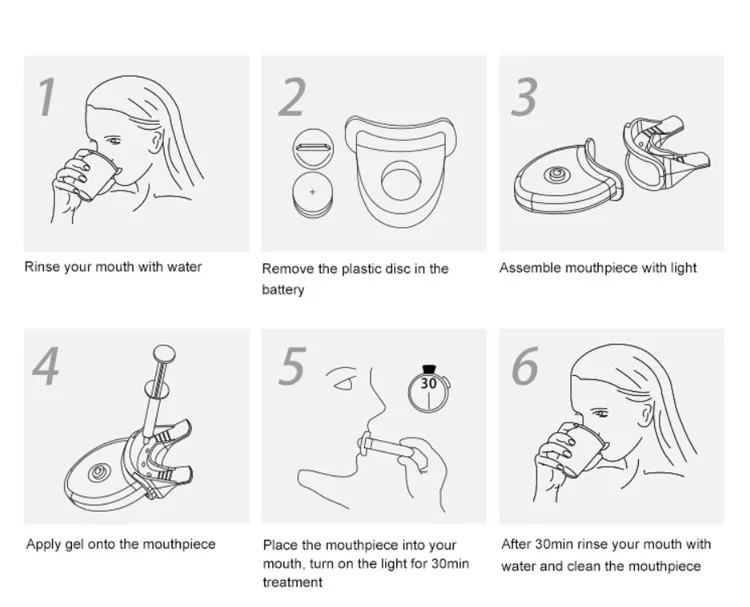 Описание: Шаг 1:Сделать себе заполненные лотки. Нагрейте лоток под 80 горячей водой и Нагрейте его около 10 секунд. Положите лоток для рта на зубы, аккуратно Используйте пальцы, пока не приклейте зубы, плотно прижмите лотки к зубам. Шаг 2:Сравните зубцы с используемыми зубцами. Шаг 3:Нанесите тонким слоем отбеливающий гель для лотки для губ и равномерно распределите (0,25 до 0,4 мл для каждого лотка больше всего впустую). Шаг 4:Вставьте лотки для рта в рот и над зубами, плотно прижмите лотки к зубам. Шаг 5:Вставьте поднос в течение 10 минут или 7 минут, затем добавьте краску в воду. Шаг 6:После отбеливания зубов используйте спрей для рта. Это сделает вас свежим дыханием. Повторите это полное лечение 2 зубцами убедитесь, что вы сушите в краску и поднос между сессией, или один раз в день, через 3 дня, сравните до и после с направляющей для затенения зубов, мы можем выглядеть лучше 7-10 теней.