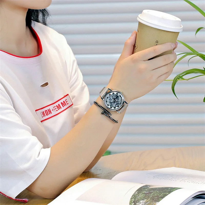 Мужские и женские наручные часы со скелетом, модные золотые наручные часы с сеткой из стали, часы reloj mujer, 2019