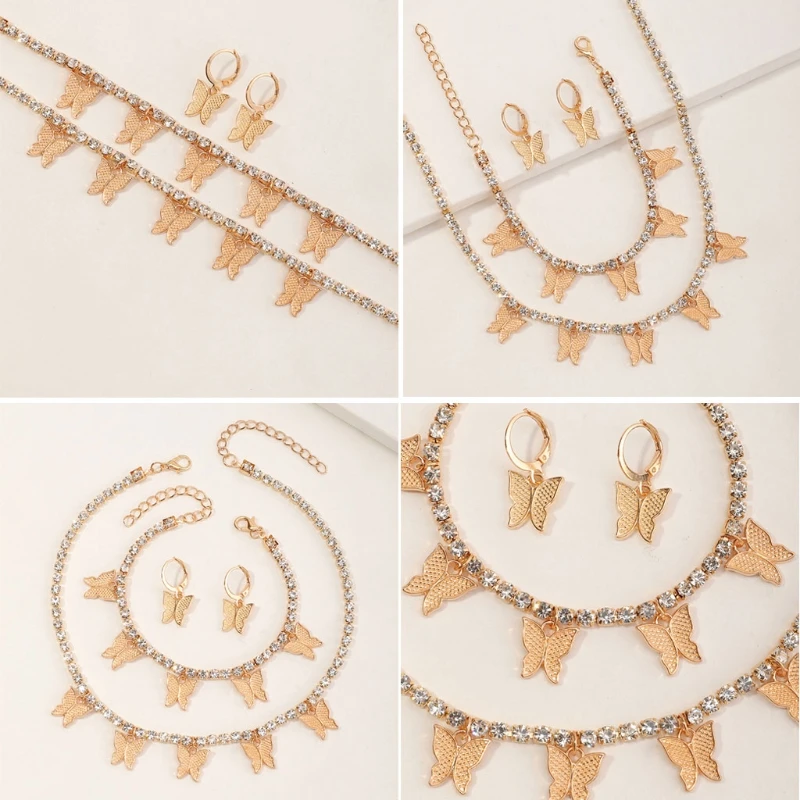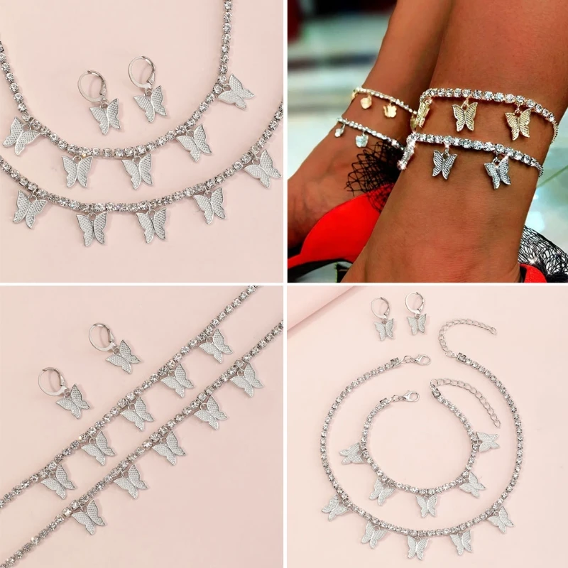Вы получите 1 ожерелье с подвеской в виде бабочки; 1 браслет в виде бабочки; 1 пара сережек в виде бабочки. Четыре цвета на выбор.