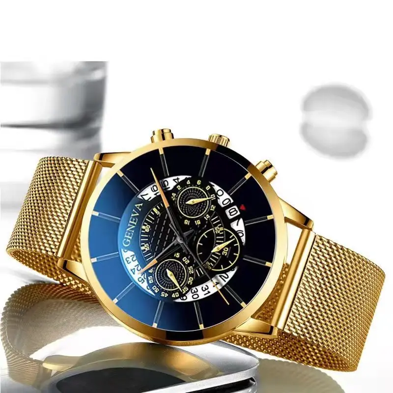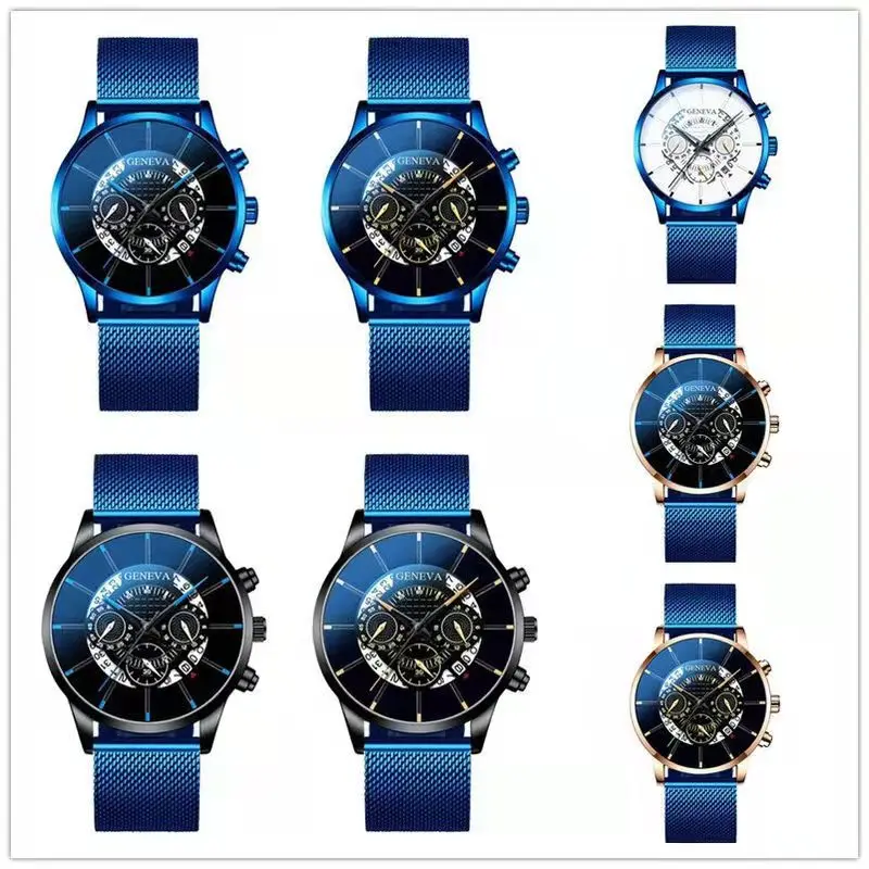Часы мужские, с сетчатым ремешком из нержавеющей стали, синие, с ка...