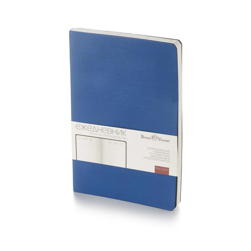 Ежедневник недатированный Bruno Visconti Megapolis Flex. Формата A5, размер изделия - 140x210 мм. Обложка синего цвета выполнена из искусственной кожи. Блок: недатированный, 136 листов (272 страницы) высококачественной бежевой бумаги (плотность 70 г/кв.м) в линейку, печать в 1 краску. Тип крепления - книжный переплет. Содержит информационно-справочный блок - международные коды городов мира, европейские аэропорты, цифровые коды ГИБДД, среднемесячная температура, телефоны первой необходимости, штриховой код, неметрические единицы, междугородные коды России и мира, денежные единицы, размеры одежды. Ежедневник отлично подойдетдля работы в офисе. Готов к персонализации.