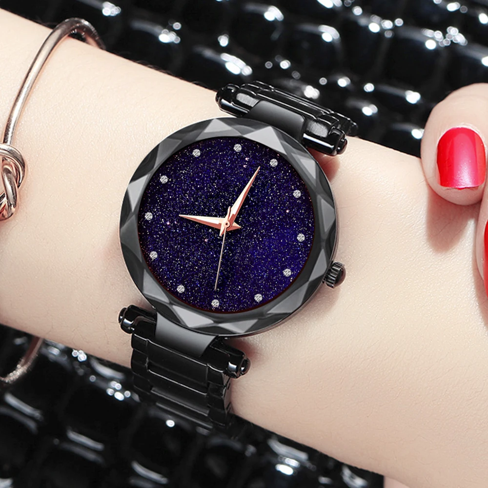 Часы женские кварцевые с магнитной застежкой, люксовые черные наручные, со звёздным небом, с сетчатым браслетом из нержавеющей стали