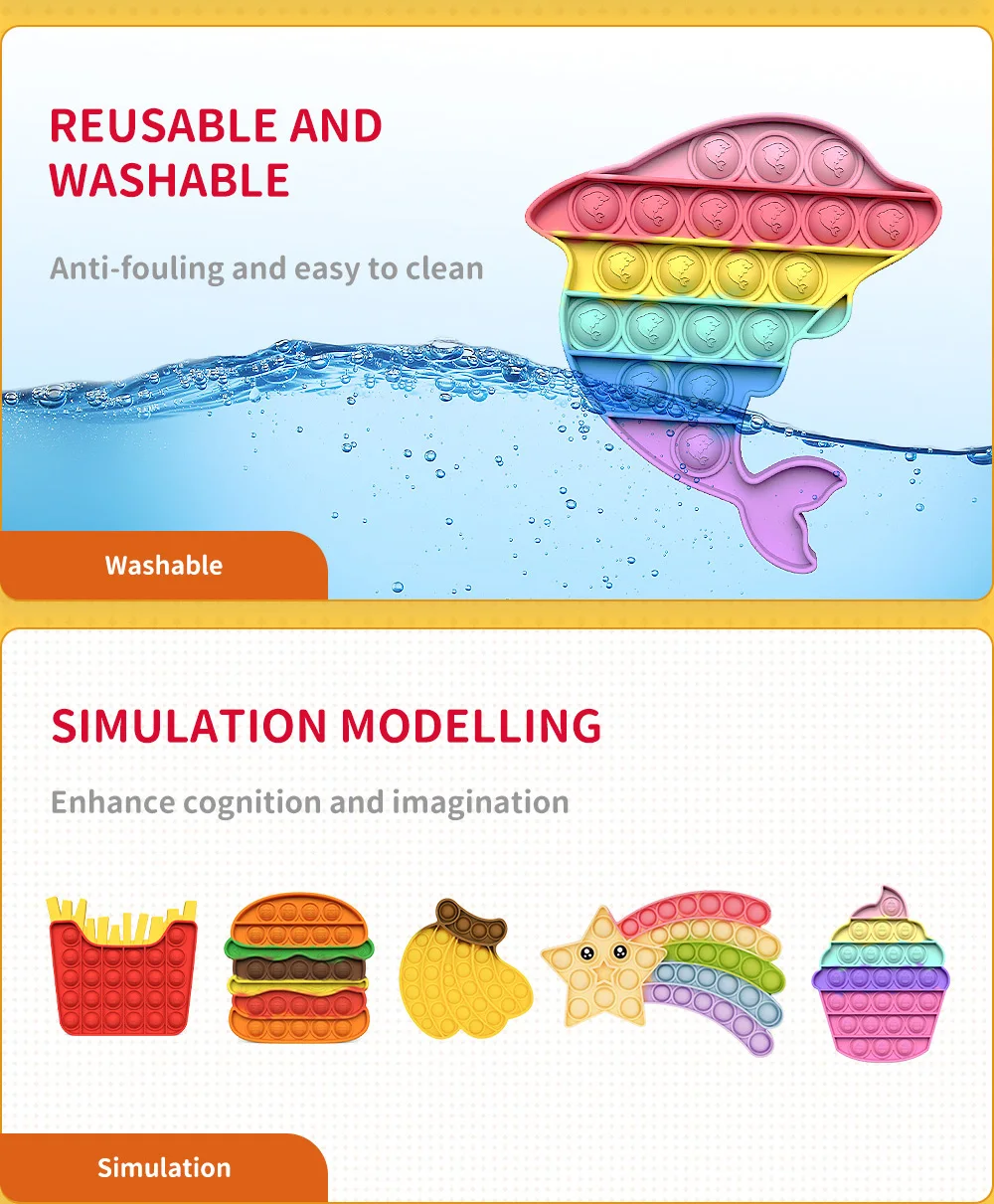 Продукт изготовлен из высококачественного пищевого силикона и получил соответствующие сертификаты проверки качества. Нетоксичный и безвкусный, и может быть очищен кипятком. Различные яркие цвета легко получить любимый для детей.При нажатии на пузырь будет слабый звук. После окончания игры вы можете перевернуть игрушку, чтобы начать следующий раунд игры.Его можно использовать для детей в возрасте до 3 лет, чтобы использовать способность ребенка захватывать предметы. Когда дети играют, они могут осуществлять свое логическое мышление и навыки расчета.