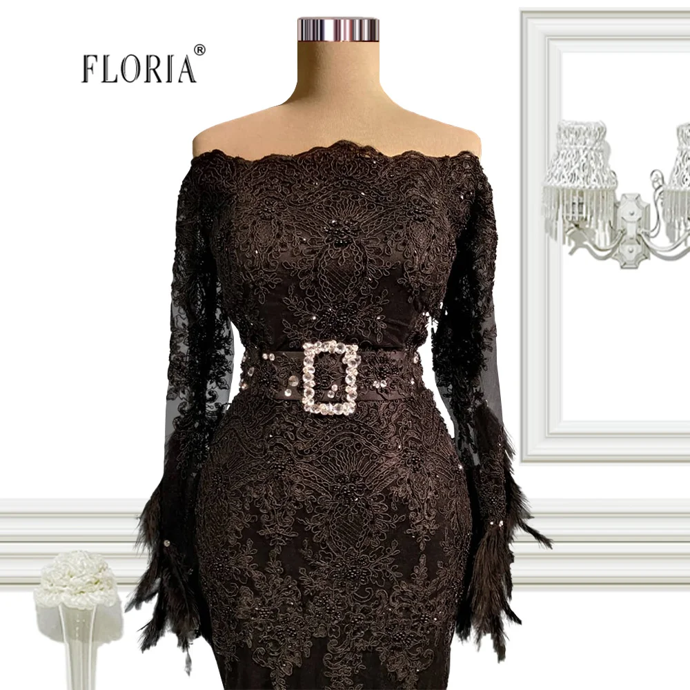 Женское вечернее платье-Русалка с открытыми плечами, длинным рукавом и перьями